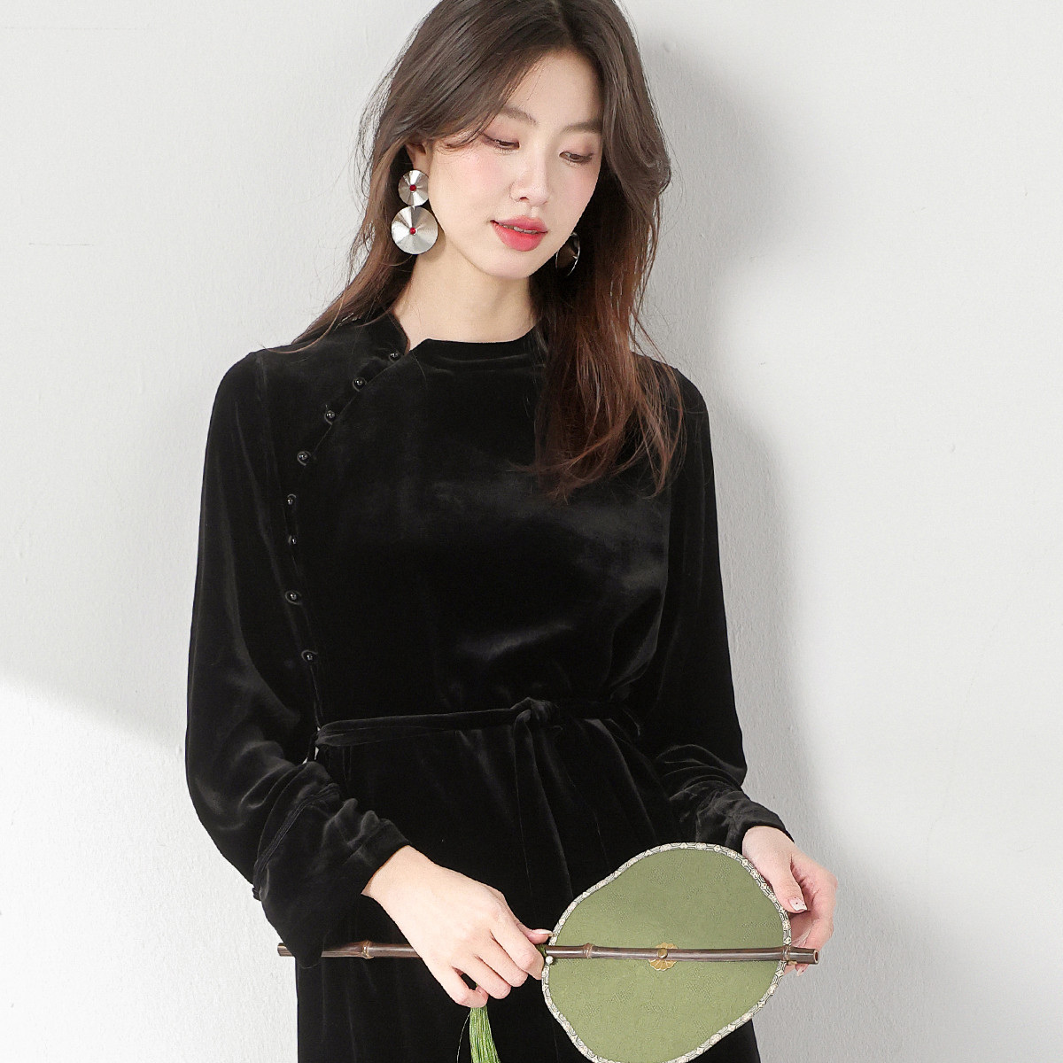 【桑蚕丝】国风新中式立领纯色系带丝绒裙子气质长袖真丝连衣裙女 868371