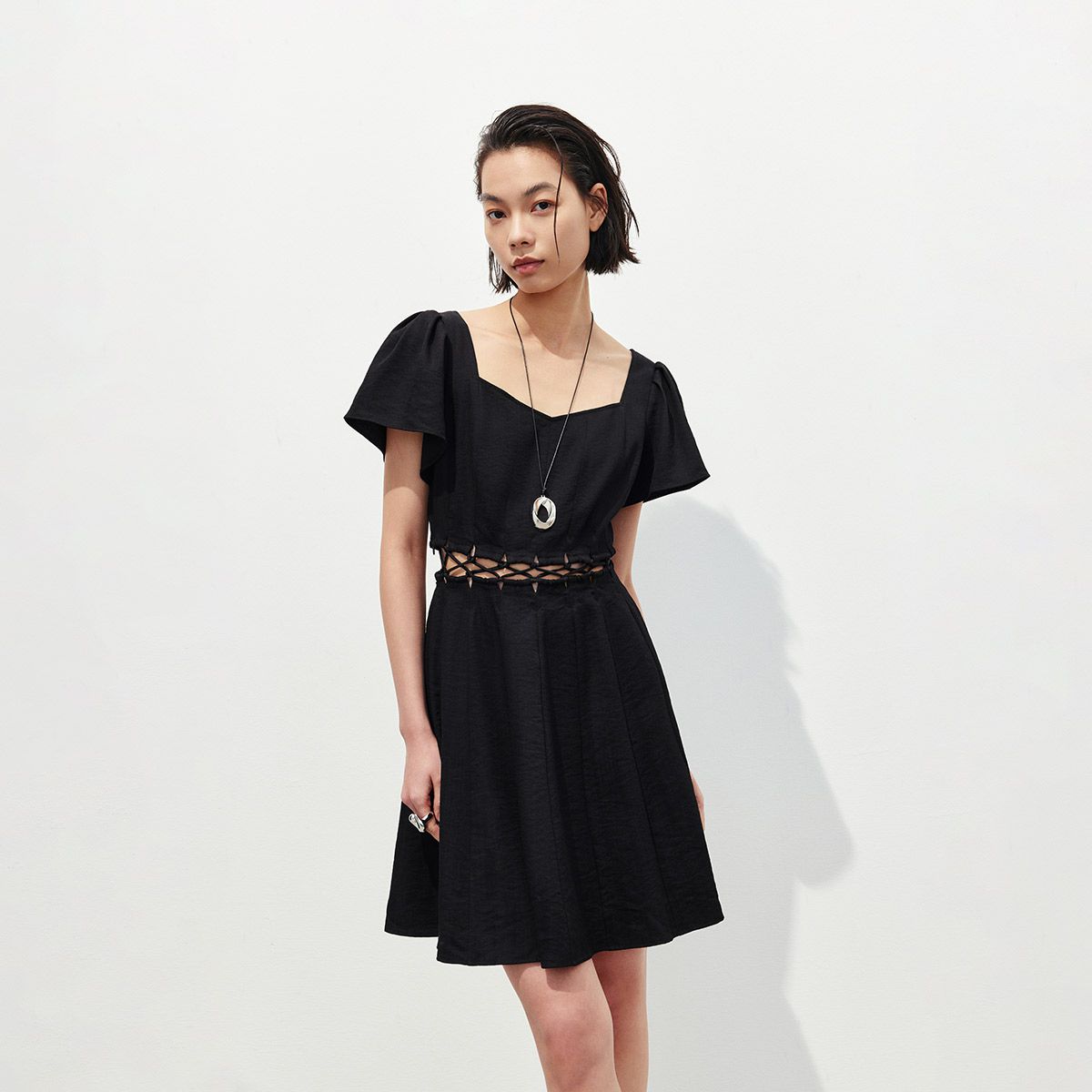【腰部镂空设计】2025春季法式淑女风纯色显瘦短袖连衣裙女 962522
