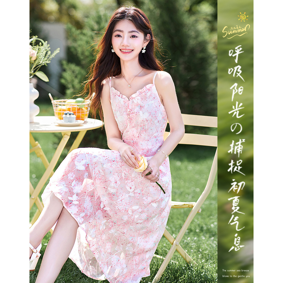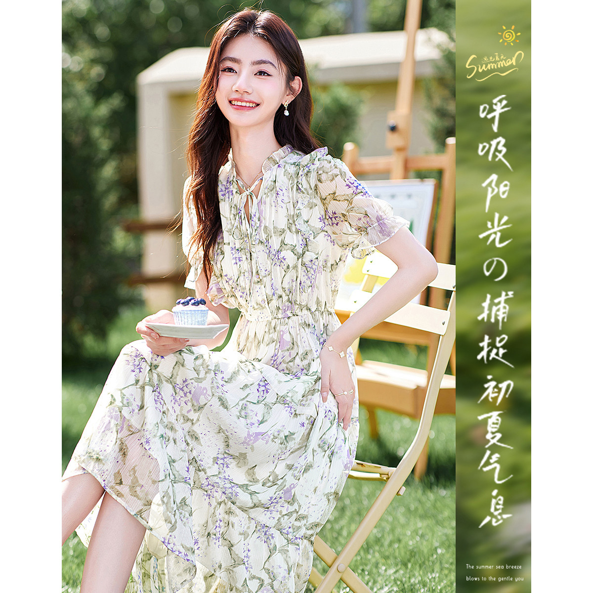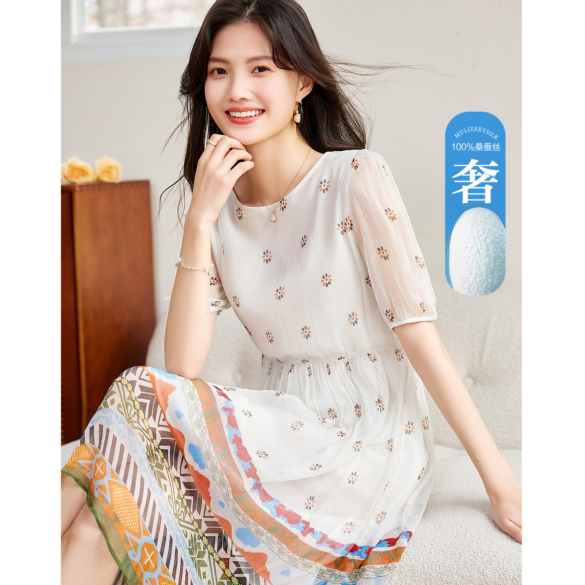 【都市佳人系列】夏奢享桑蚕丝碎花a字浪漫连衣裙女 005505