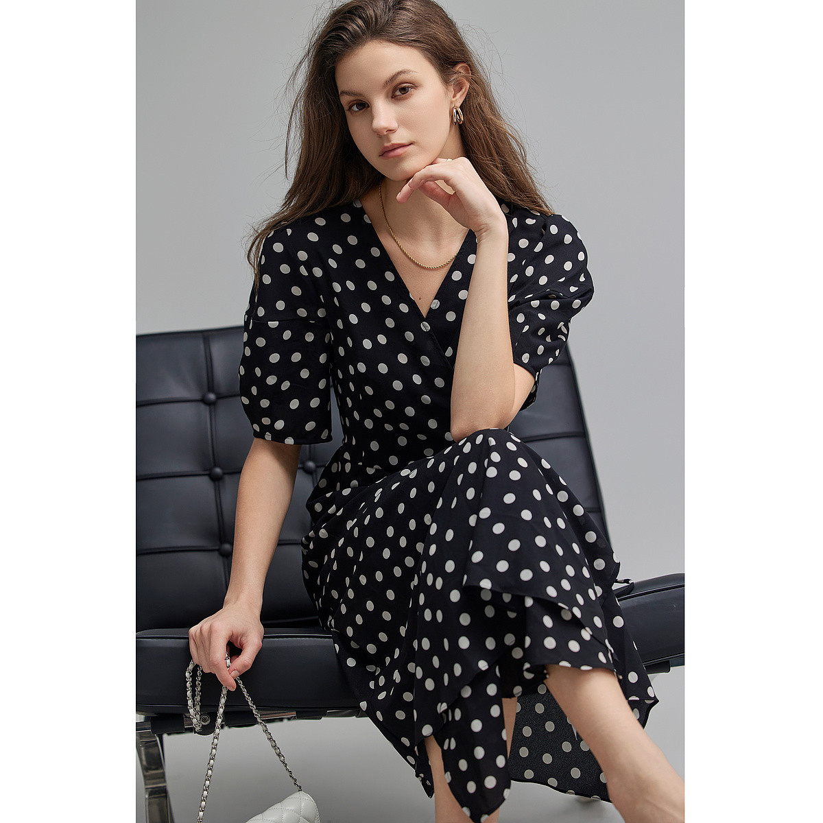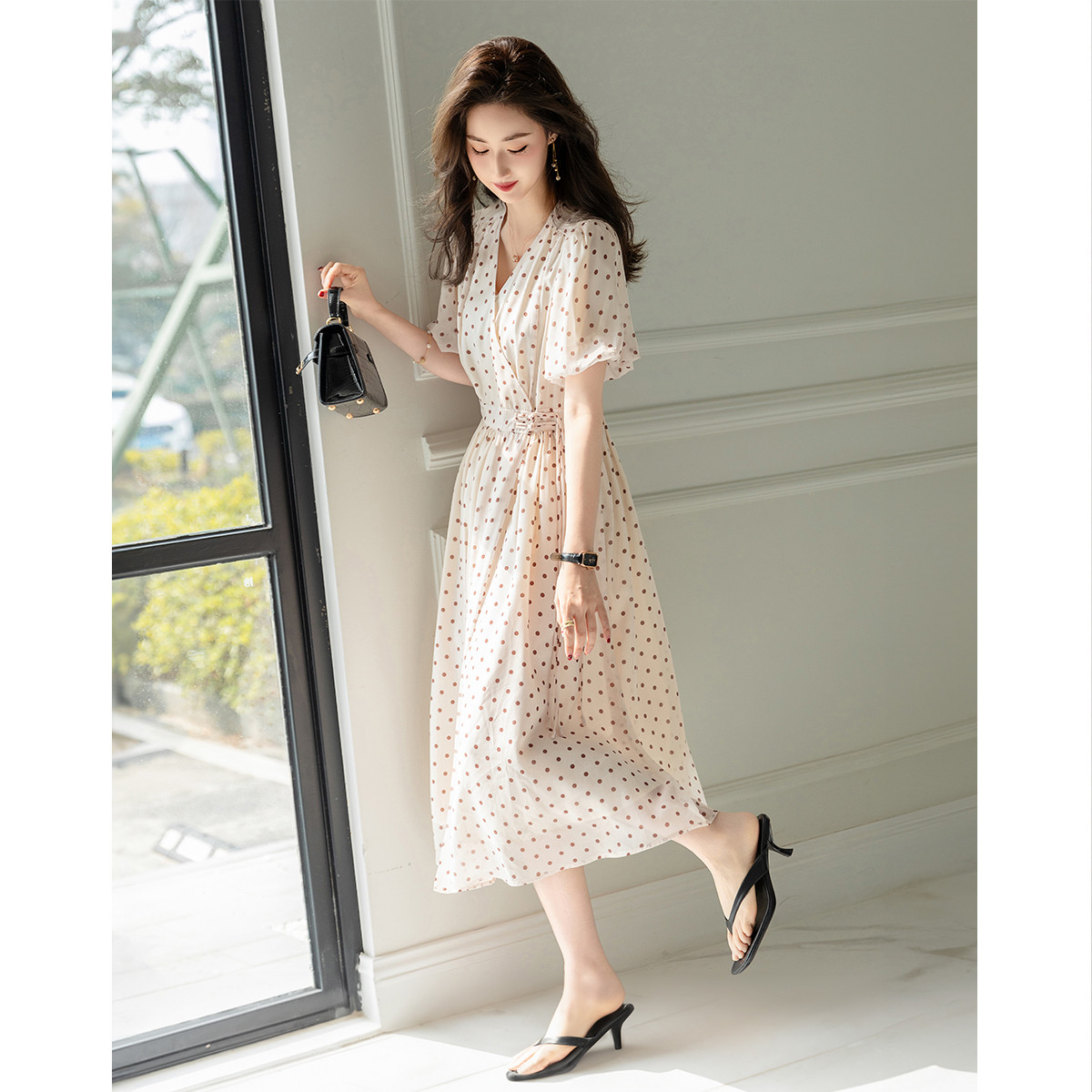 【法式下午茶】夏V领波点包裹式茶歇裙交叉绑带连衣裙女中长款 577217