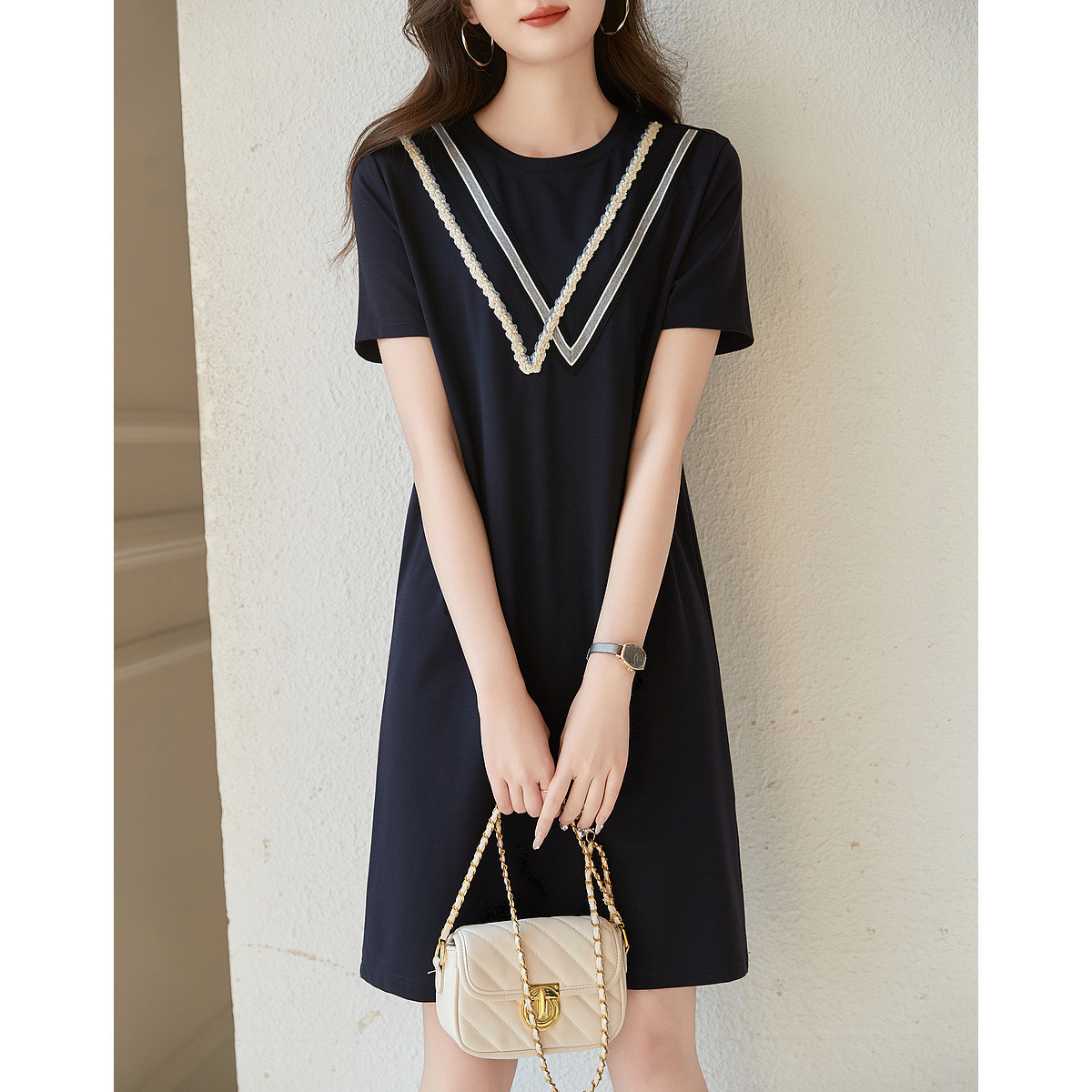 【复古姐姐裙】夏减龄圆领罗马棉绞花织带直筒短袖连衣裙女中长款 410817