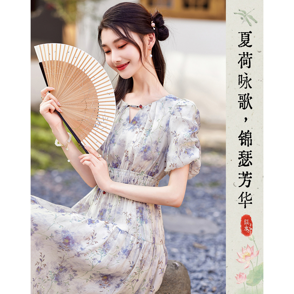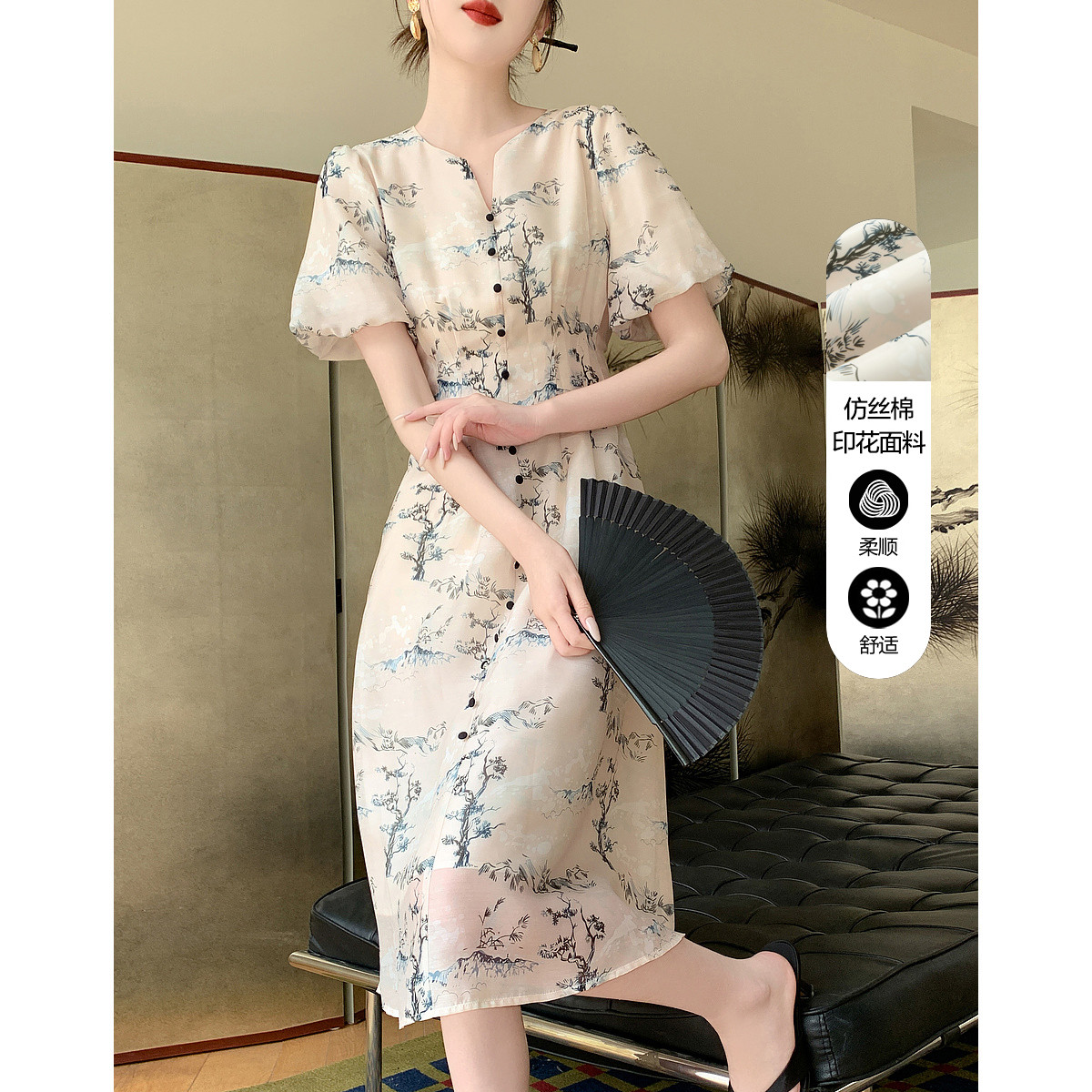 【清扬婉兮】夏国风新中式V领仿丝棉印花旗袍裙花苞袖收腰连衣裙 478145