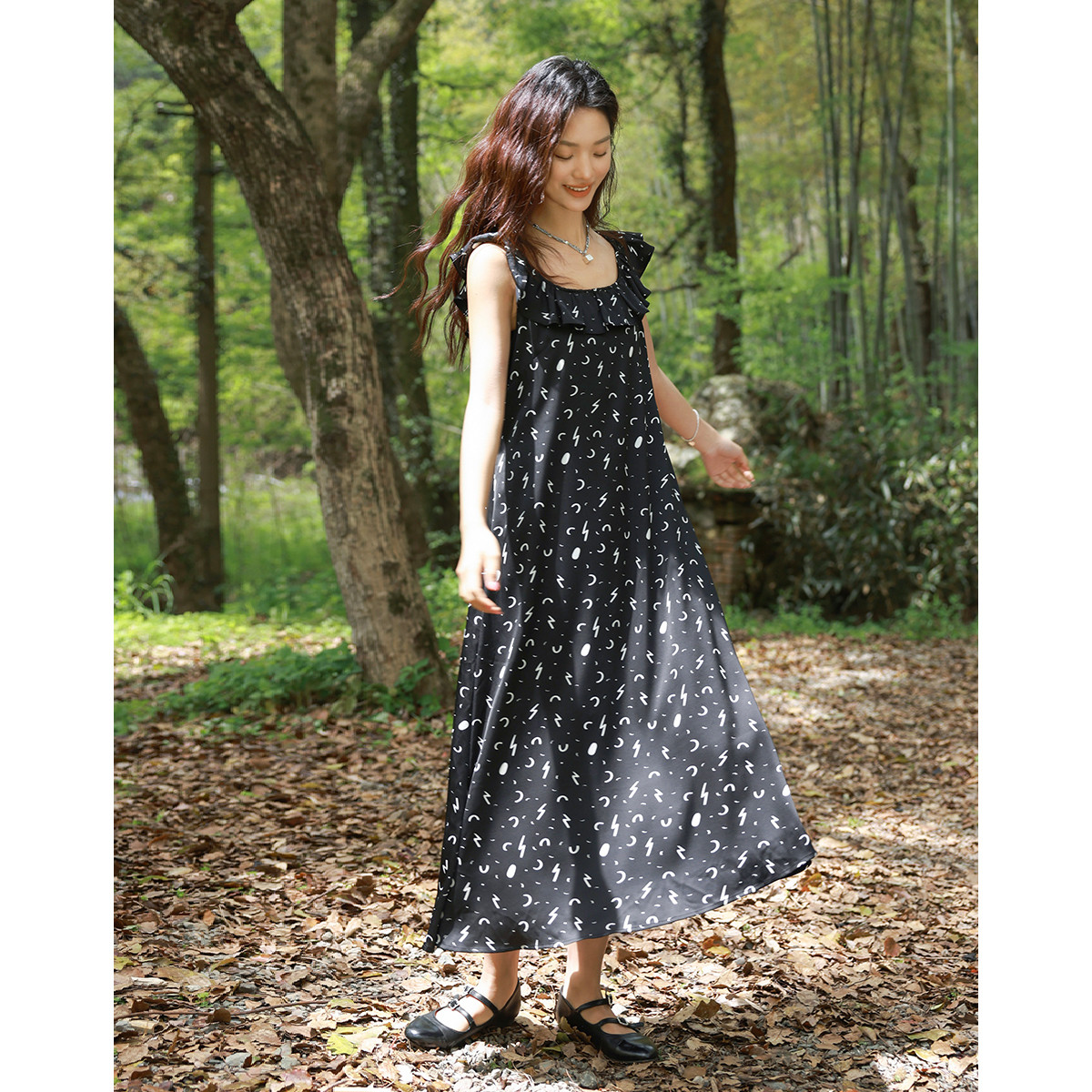 【轻奢度假】夏圆领桑蚕丝调节腰无袖抽绳印花复古连衣裙 620097