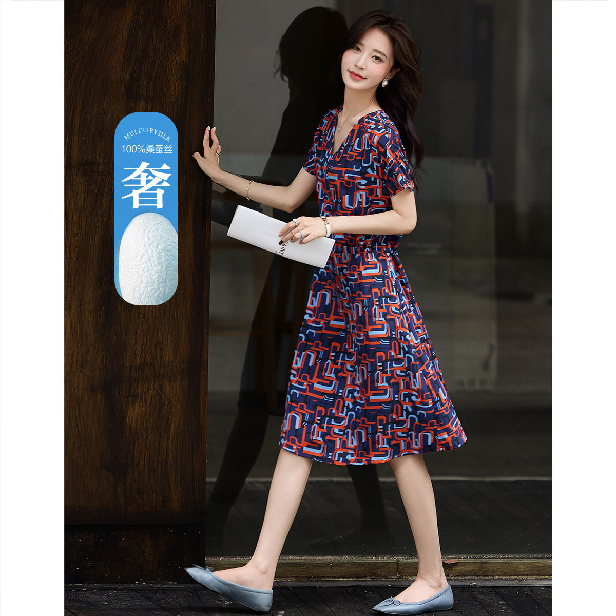 【优雅轻熟风】夏V领桑蚕丝碎花腰带直筒连衣裙女中长款 342785