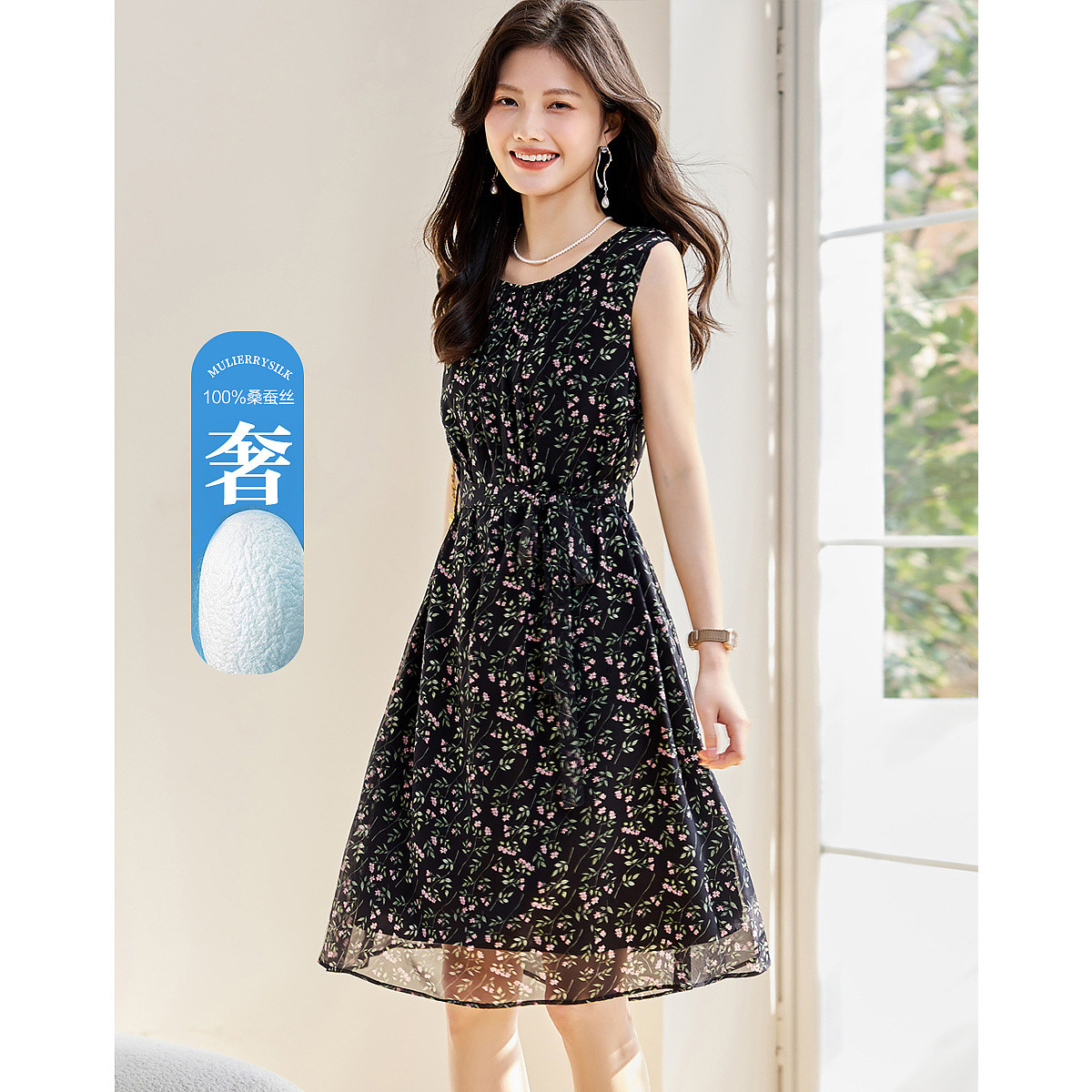 【优雅黑天鹅系列】夏圆领桑蚕丝碎花腰带无袖背心连衣裙 010625