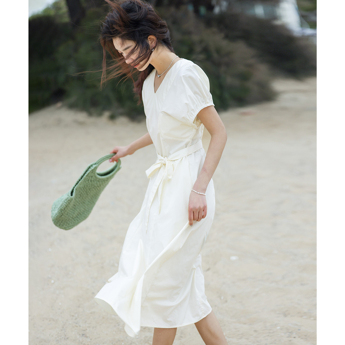 【轻氧连衣裙】夏简约衬气质 V领天鹅颈文艺感显瘦长裙 104322