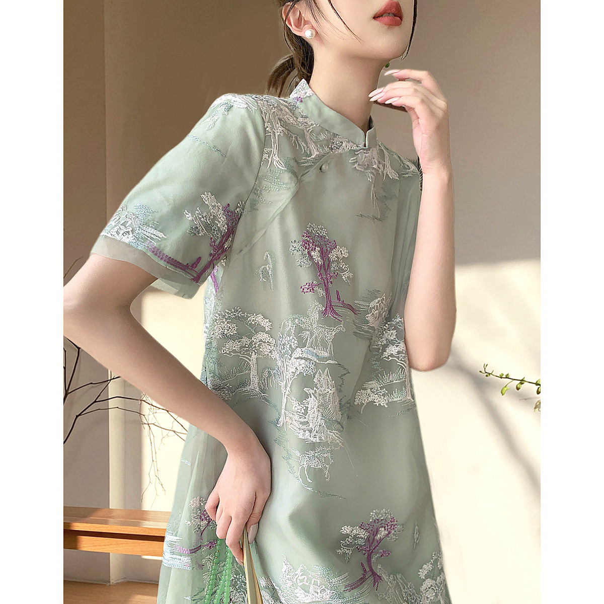 【半溪明月】夏国风新中式轻盈仿天丝绣花舒适藏肉半高领连衣裙 550081