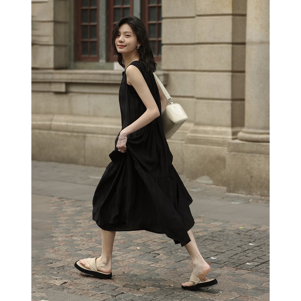 【舒适简约小黑裙】夏款圆领半门襟无袖侧口袋长款连衣裙 063362