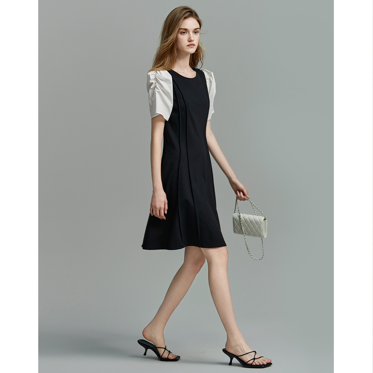【淑女手札】夏通勤圆领舒适罗马棉泡泡袖收腰a字撞色针织连衣裙 907201