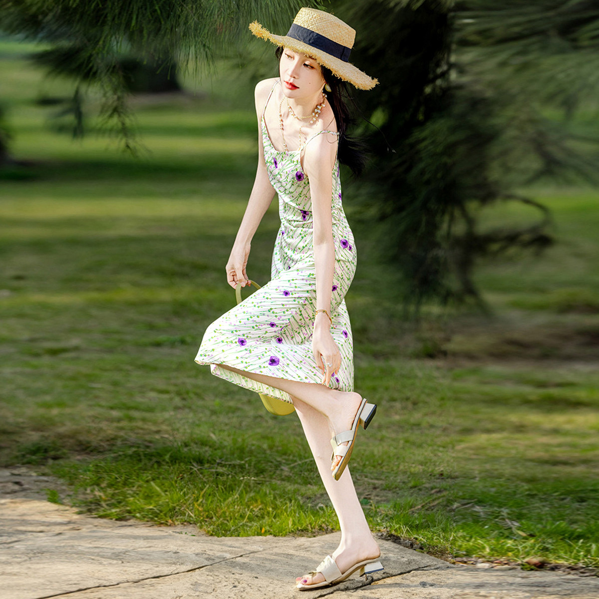 【唤醒了温柔】夏法式优雅丝滑雪纺印花斜丝裁剪藏肉吊带连衣裙 870337