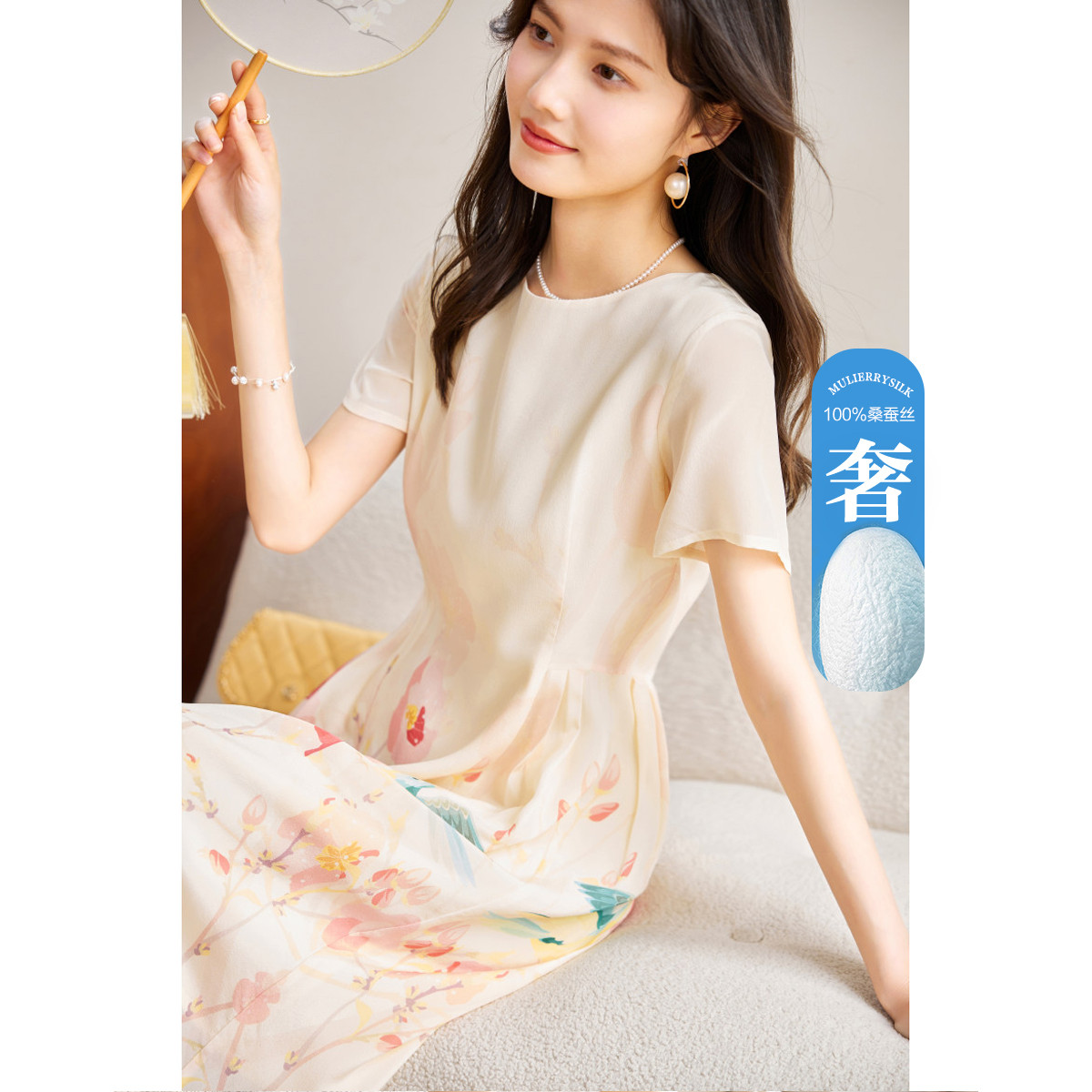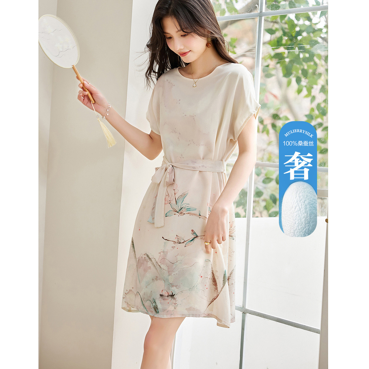 【国风下江南】夏圆领桑蚕丝手绘印花调节腰连衣裙女中长 021121