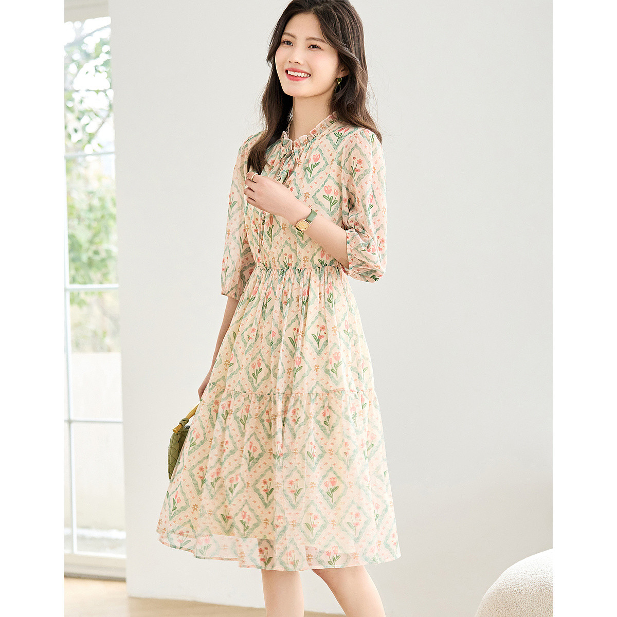 【草色芊芊】V领75D乱麻雪纺印花茶歇裙抽褶收腰连衣裙女中长 238913
