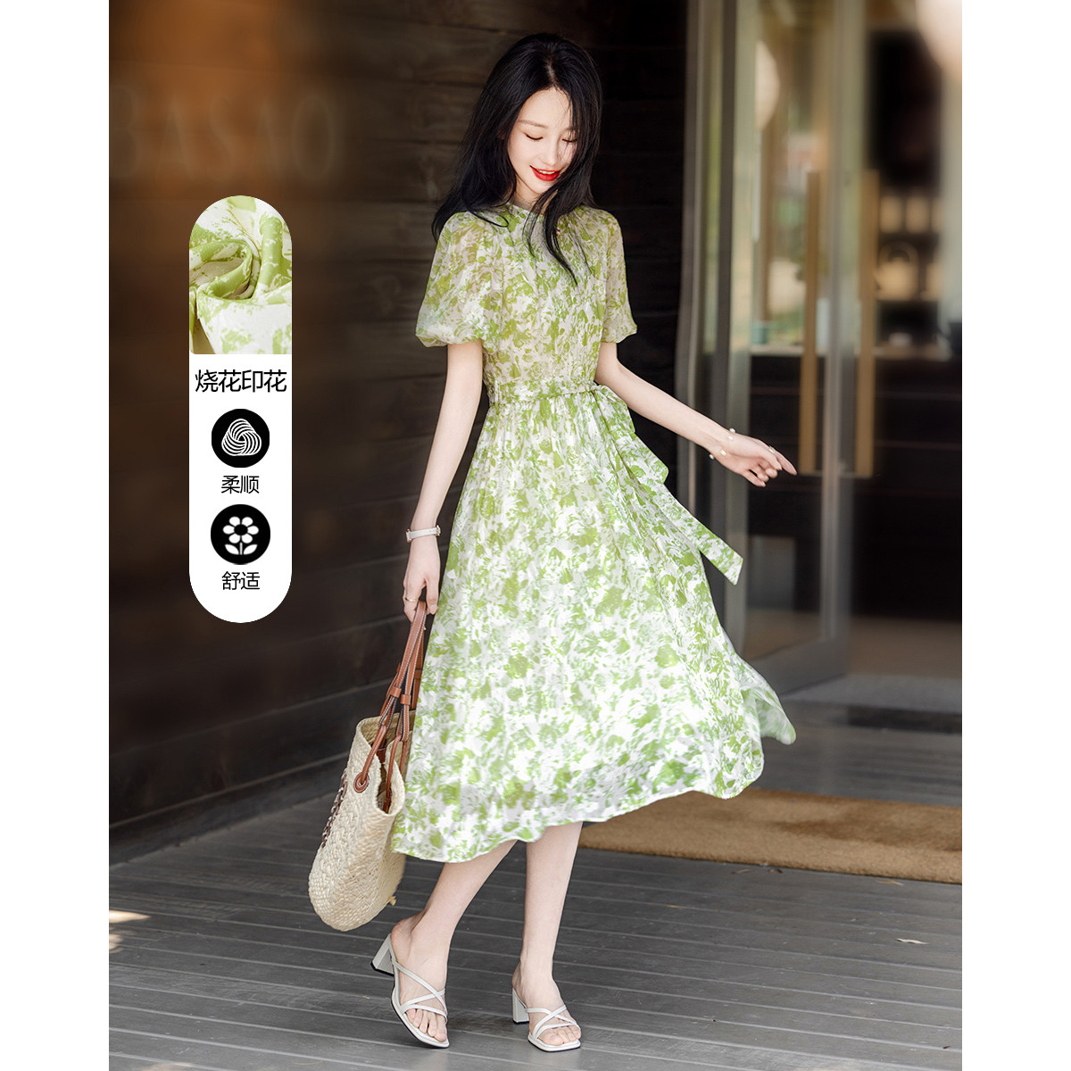 【薄荷曼波】夏法式烧花镂空工艺印花泡泡袖系带大摆藏肉连衣裙 200065