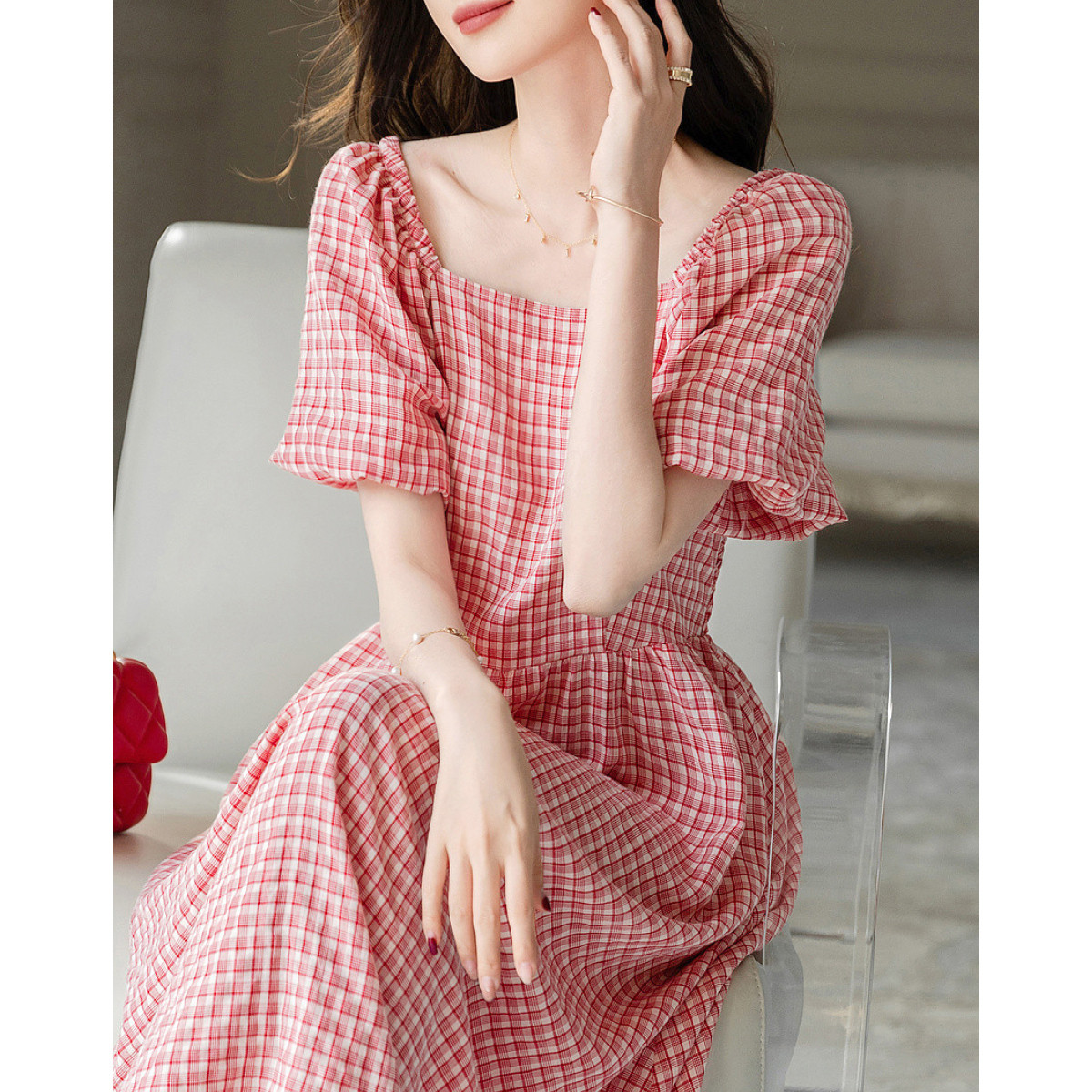 【法式公主风】夏圆领一字肩司马克松紧收腰大摆a字格纹连衣裙女 506625