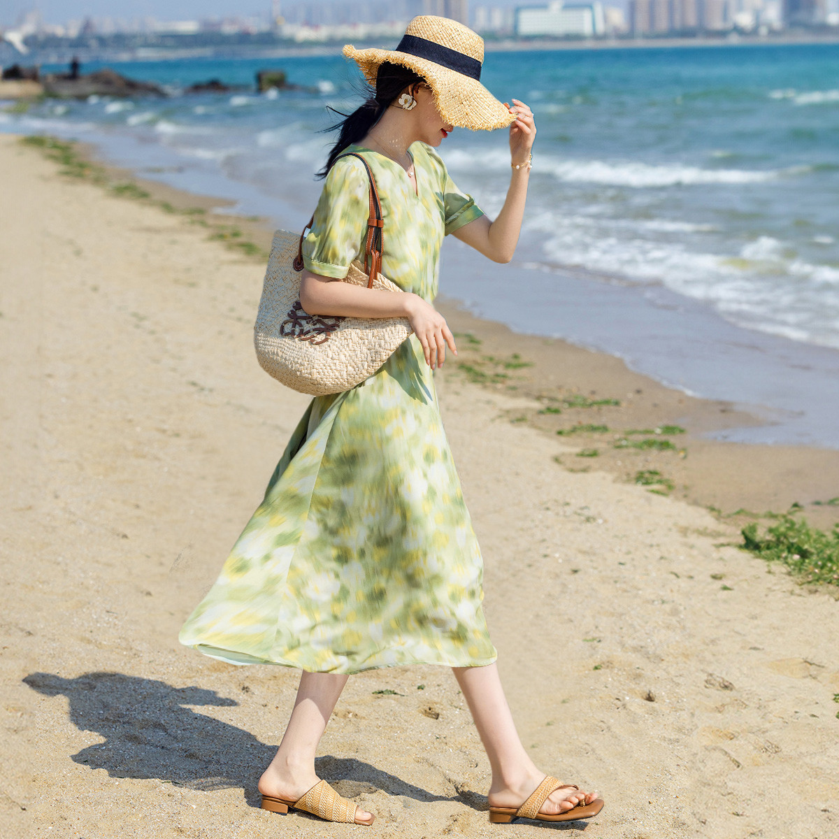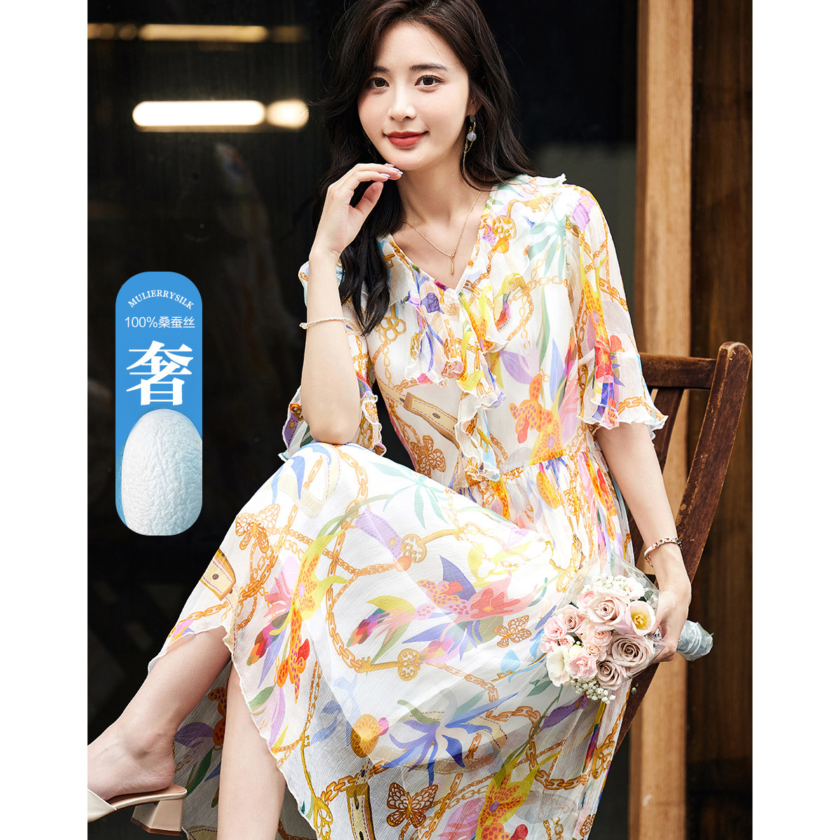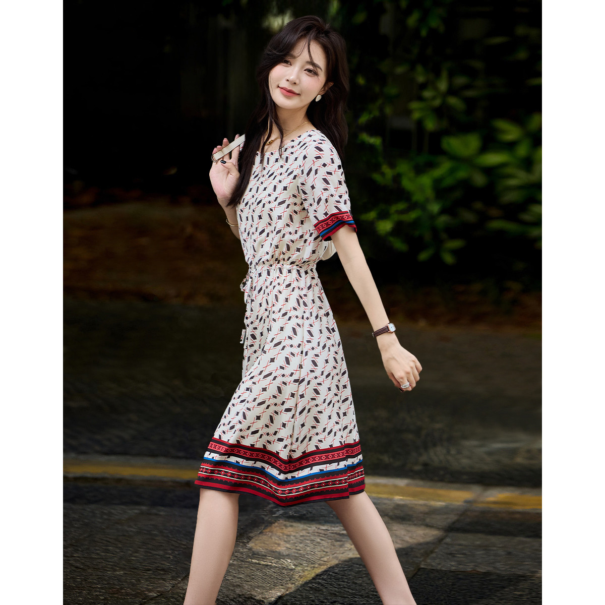 【文艺法风腔调】夏V领桑蚕丝印花直筒系带连衣裙女中长 064577