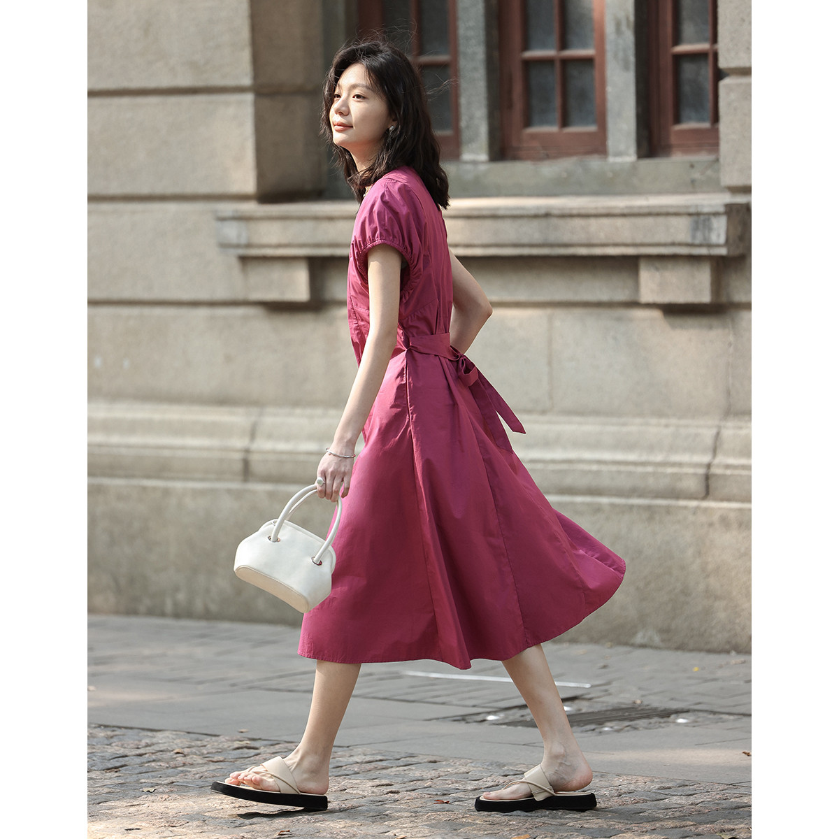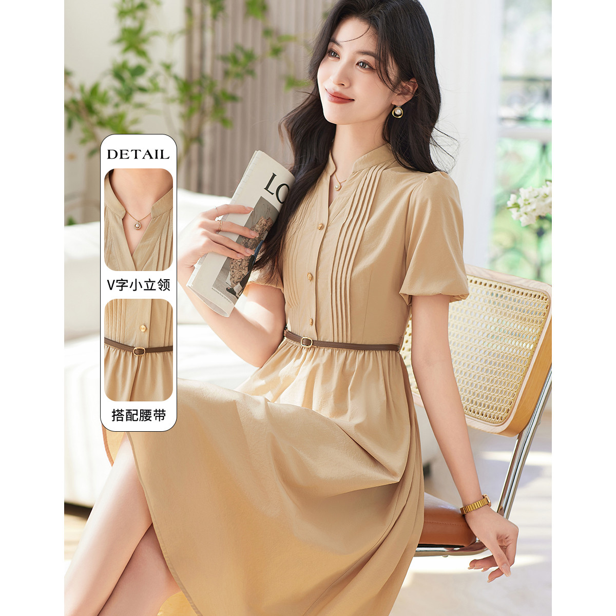 【树莓气质小v领长裙】夏款显白腰带中长款连衣裙 305026