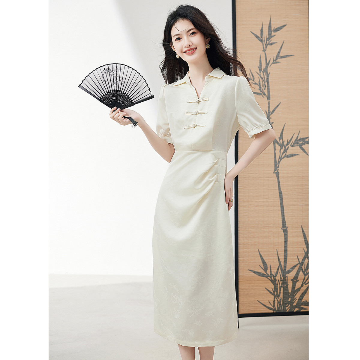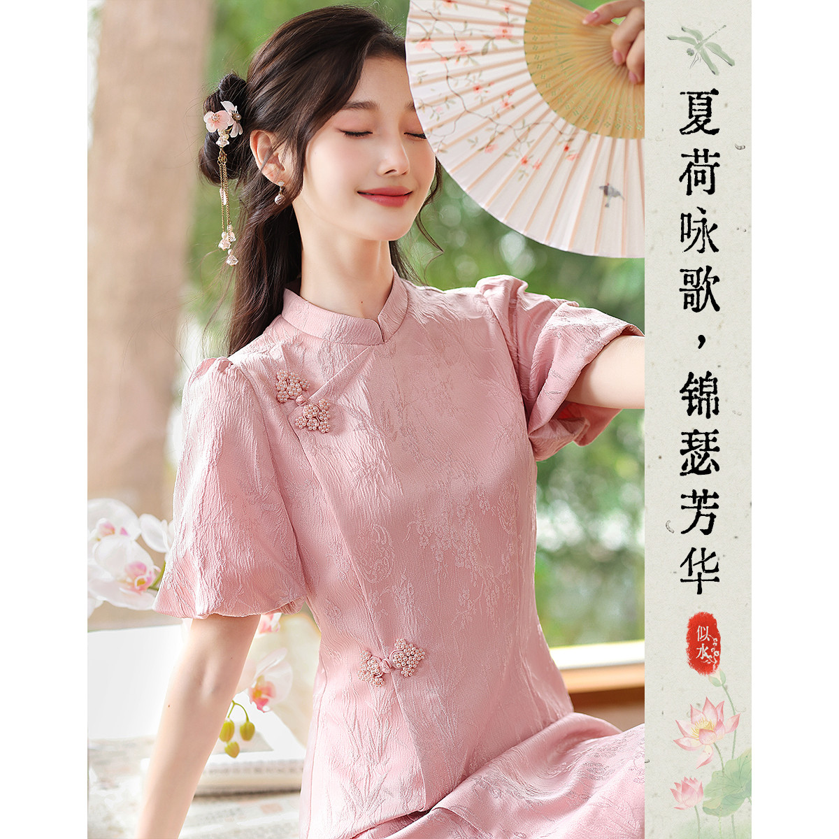 【粉韵东方】夏高级感改良旗袍灯笼花苞设计感显瘦小个子连衣裙 042136