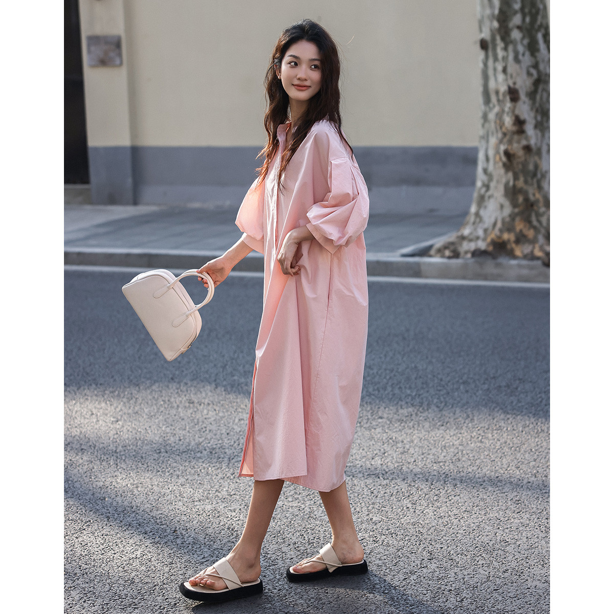 【嫩粉色中袖连衣裙】夏款粉嫩圆领泡泡袖长款连衣裙女 239490