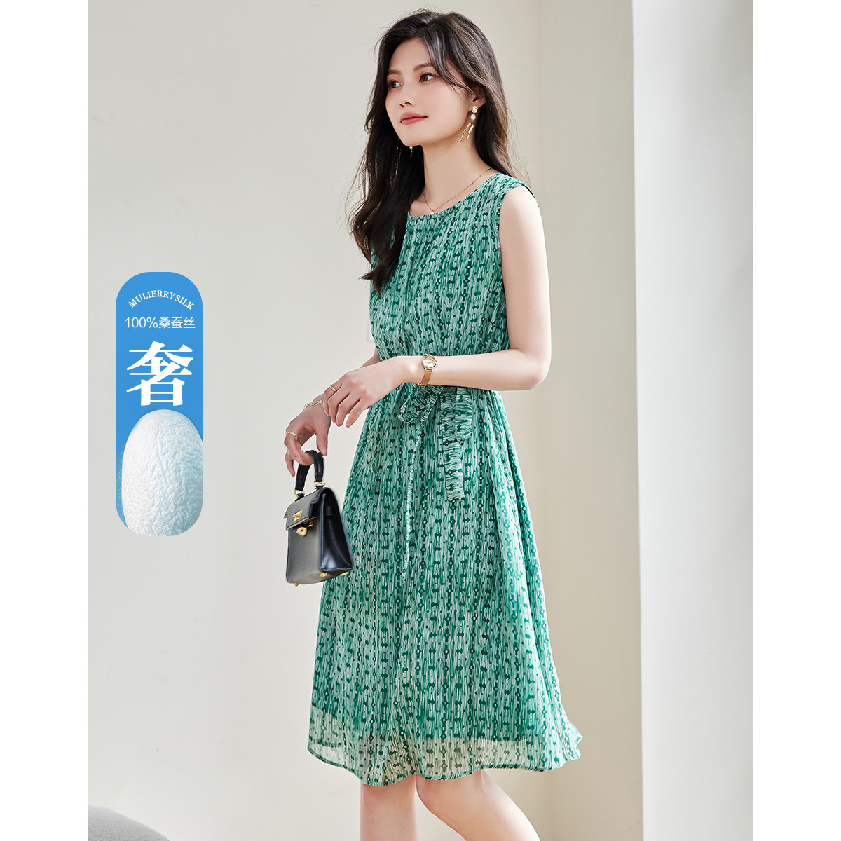 【轻奢度假】夏圆领桑蚕丝调节腰无袖抽绳印花复古连衣裙 620097