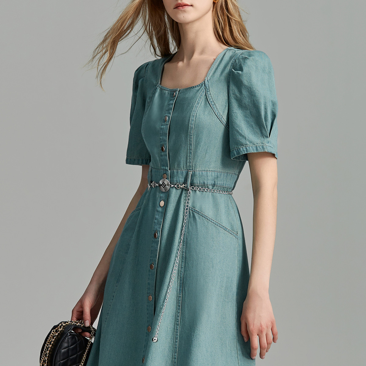 【气质姐姐裙】夏方领立体收腰小A泡泡袖短袖牛仔连衣裙女中长款 907073