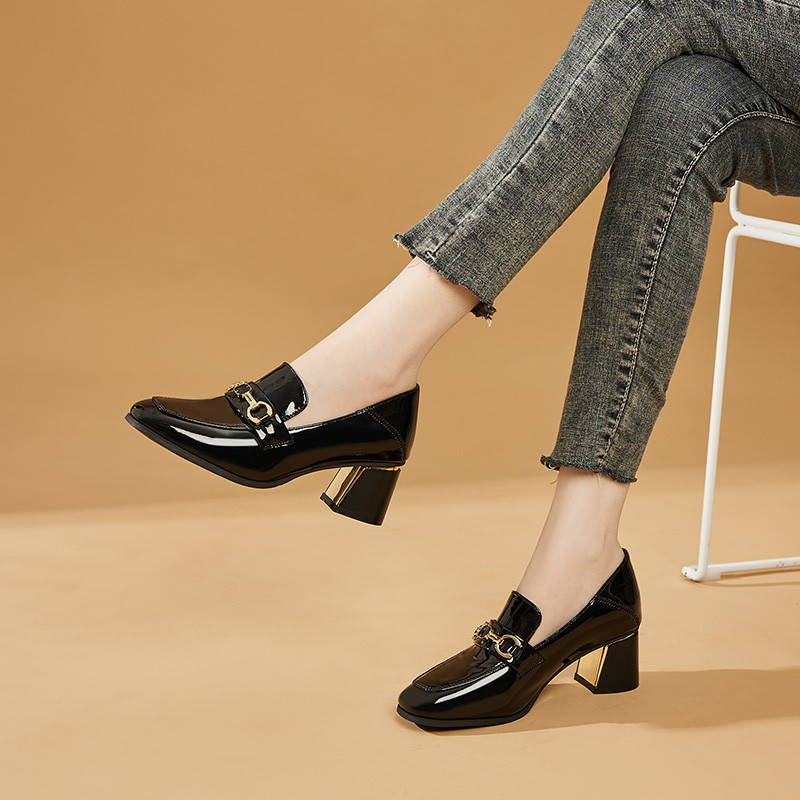 法式春秋季学院风通勤鞋简约浅口粗跟女单鞋乐福鞋女鞋 346010