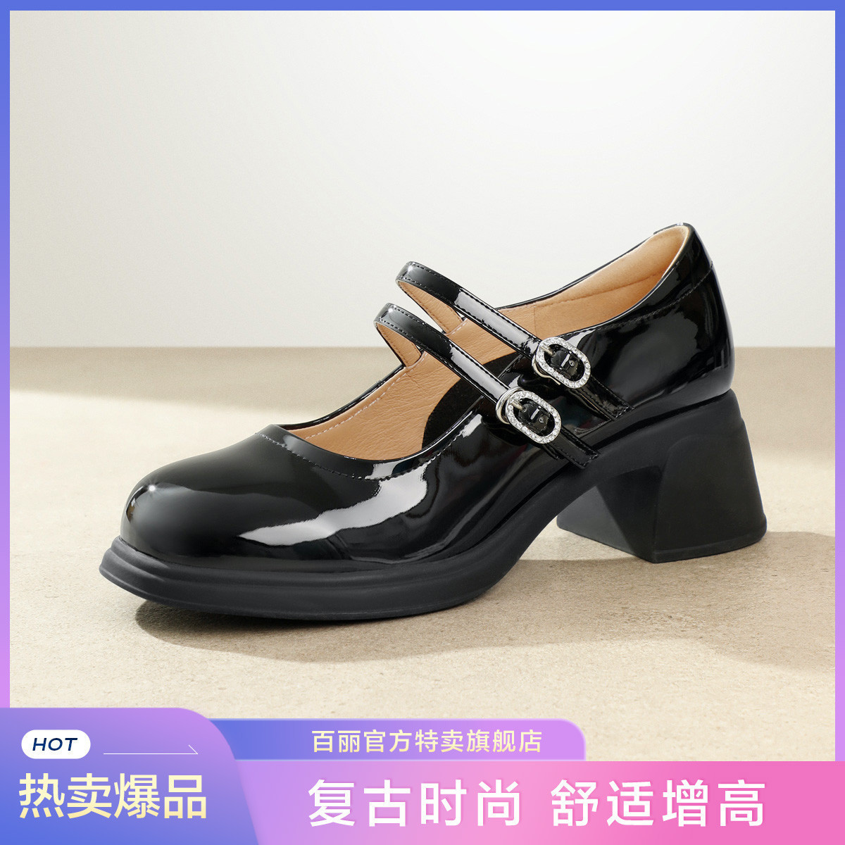 百丽粗高跟玛丽珍女款春夏通勤漆皮小皮鞋浅口单鞋 346714
