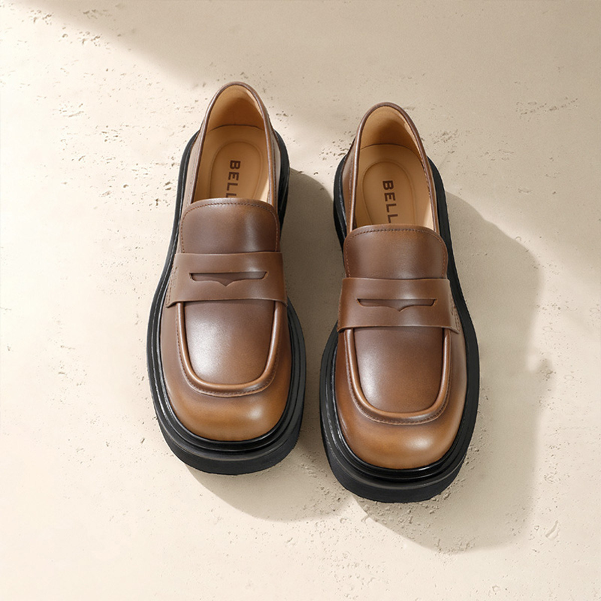 百丽女鞋子复古英伦风厚底乐福鞋女真皮小皮鞋子 886746