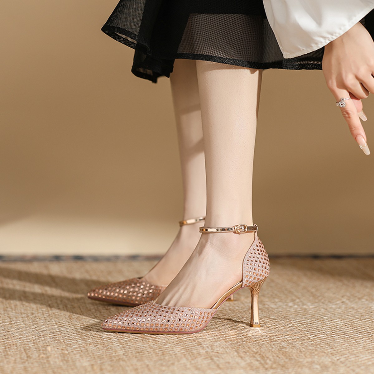 夏季仙女风高跟鞋时装鞋时尚通勤鞋中空凉鞋婚鞋方钻细跟女单鞋 333143