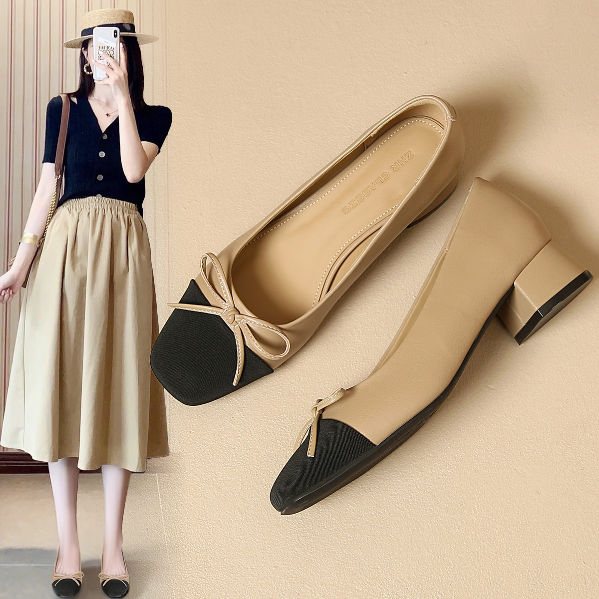 【小香风】蝴蝶结百搭方头通勤鞋女复古夏季一脚蹬女鞋粗跟单鞋女 948544
