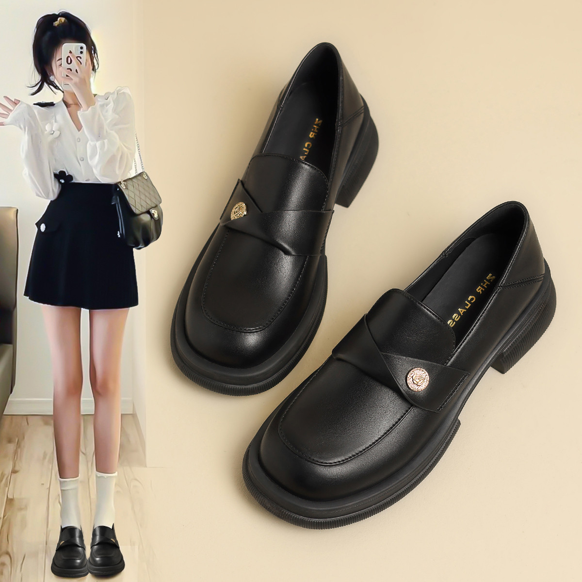【金币饰扣】一脚蹬小皮鞋亮面制服鞋女单鞋厚底鞋春秋女鞋乐福鞋 738112