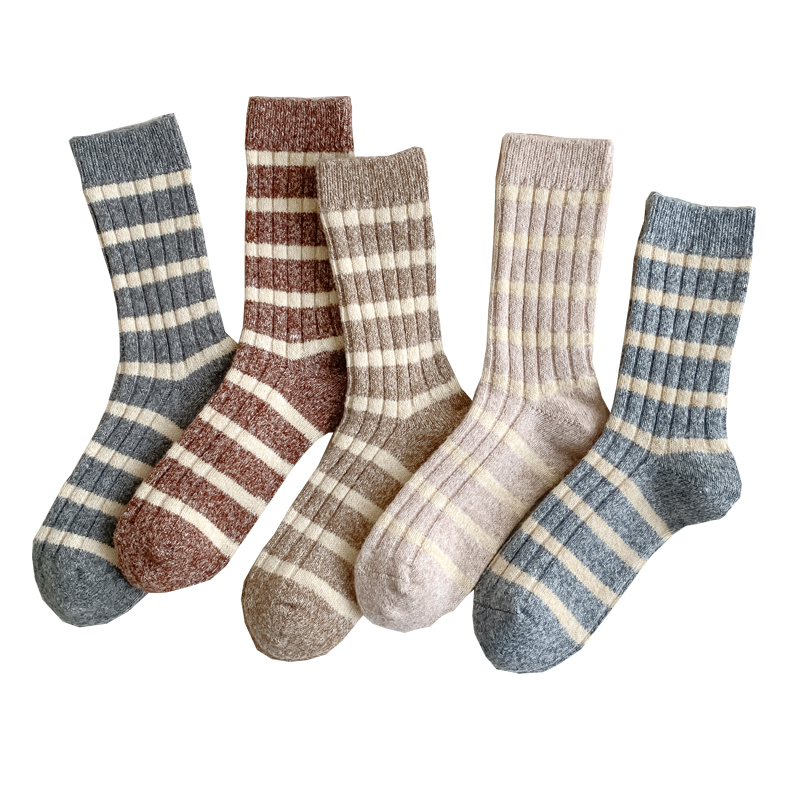【5双装】朝暮栖止粗针毛绒袜感厚袜子女冬条纹保暖冬双针南极绒中筒堆堆袜
