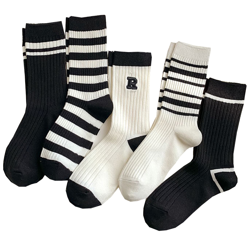 【5双装】朝暮栖止女士黑白刺绣R款中筒袜透气吸汗印花棉袜子