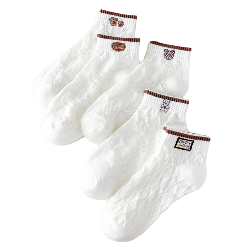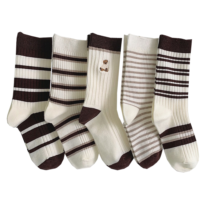 【5双装】朝暮栖止女士咖色刺绣小熊中筒袜透气吸汗潮流棉袜子
