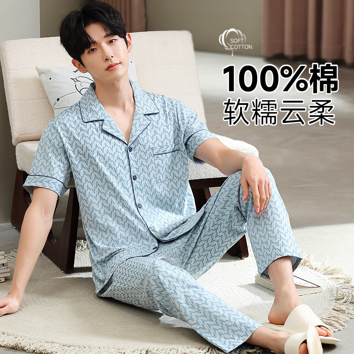 【100%棉】高级感春秋男士家居服睡衣全棉短袖衬衫长裤套装男 218251