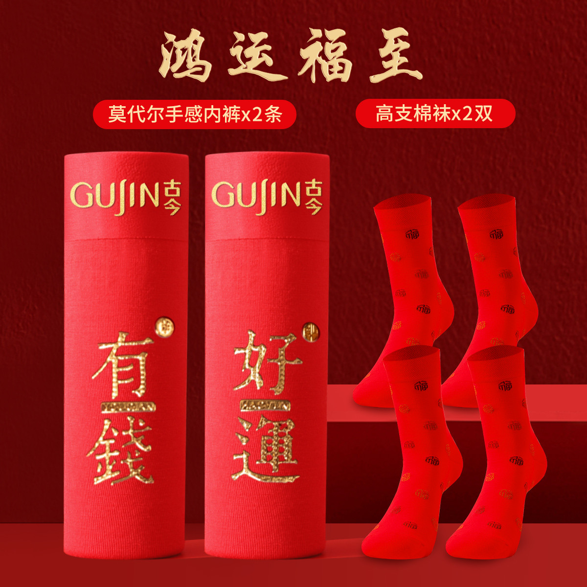 【好运大红4件组合套装】男士内裤大红色平角裤喜庆透气四角裤头 086046