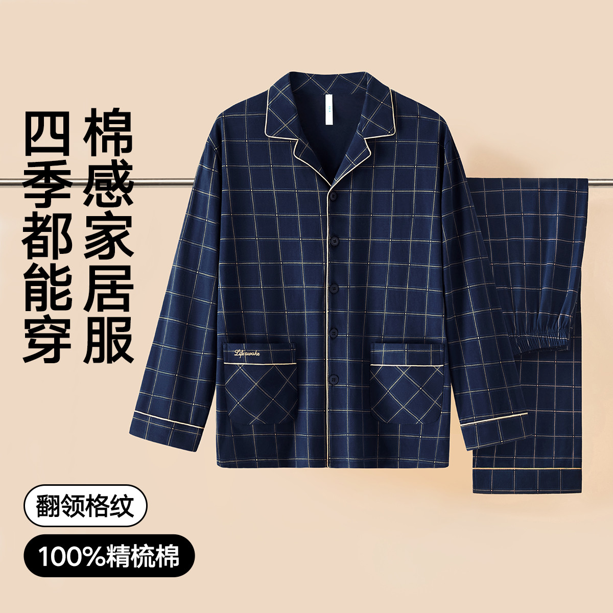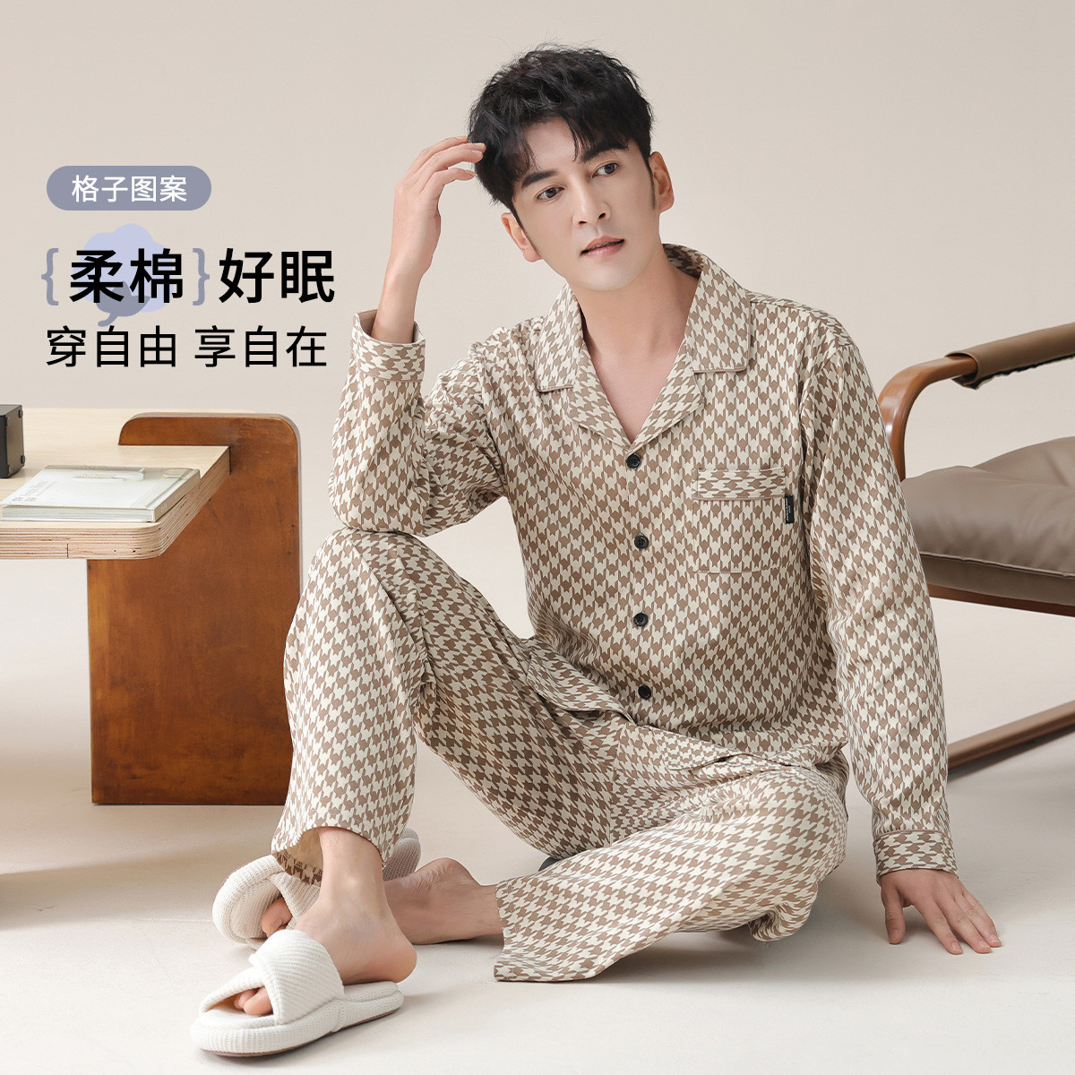 【千鸟格纹】可外穿男睡衣套装春季款95%柔棉开衫长袖家居服 981643