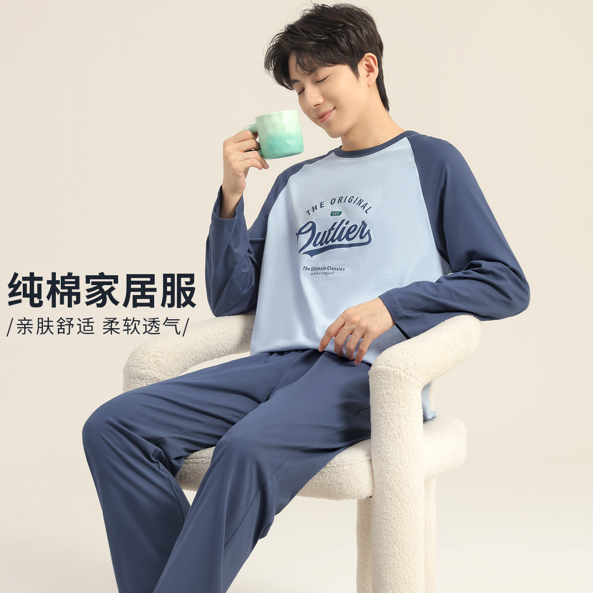 【100%棉】男士纯棉睡衣春秋长袖圆领可外穿两件套家居服睡衣 875019