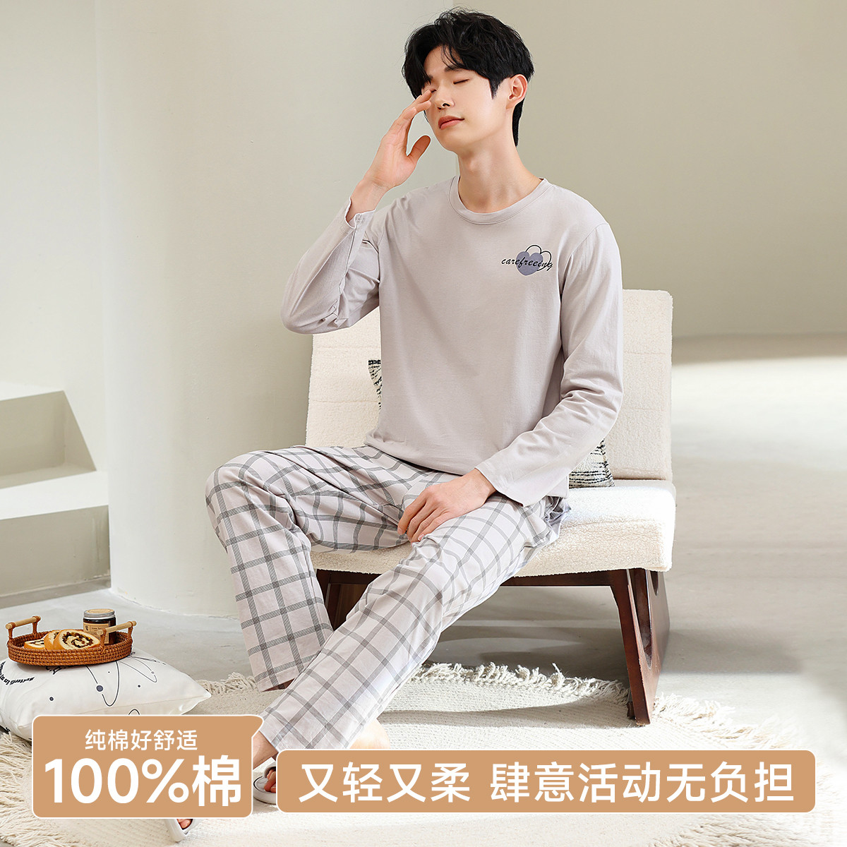 【100%棉】插肩袖格纹套头套装纯棉睡衣男士家居服舒适柔软 895947