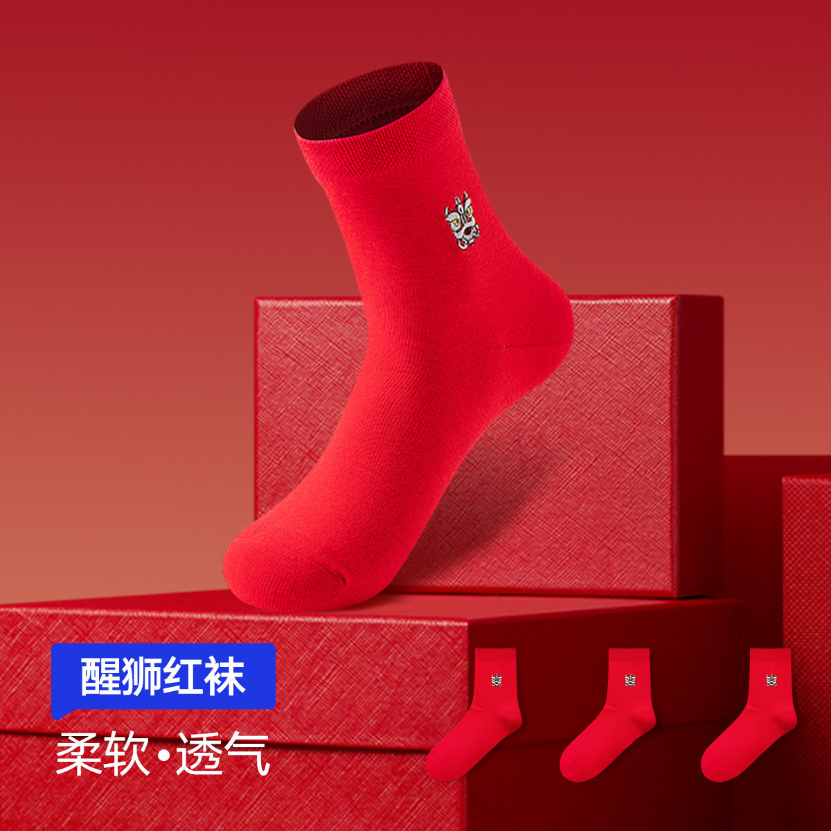 【100%纯棉 国风鸿运】3双装男士大红中筒袜蛇年本命年男袜 878234