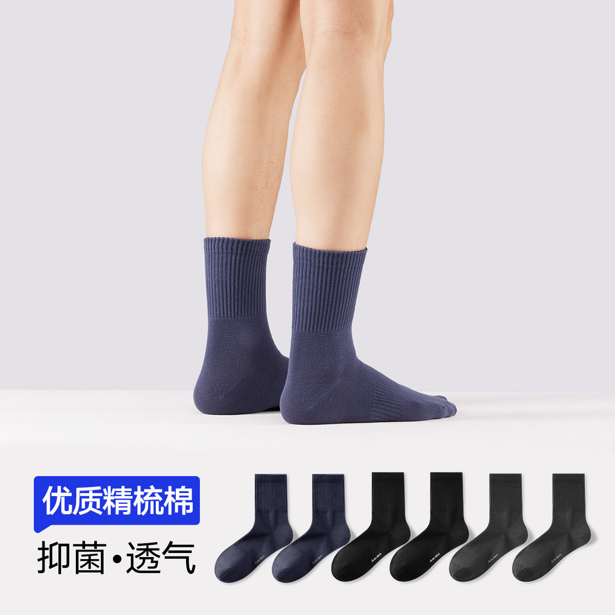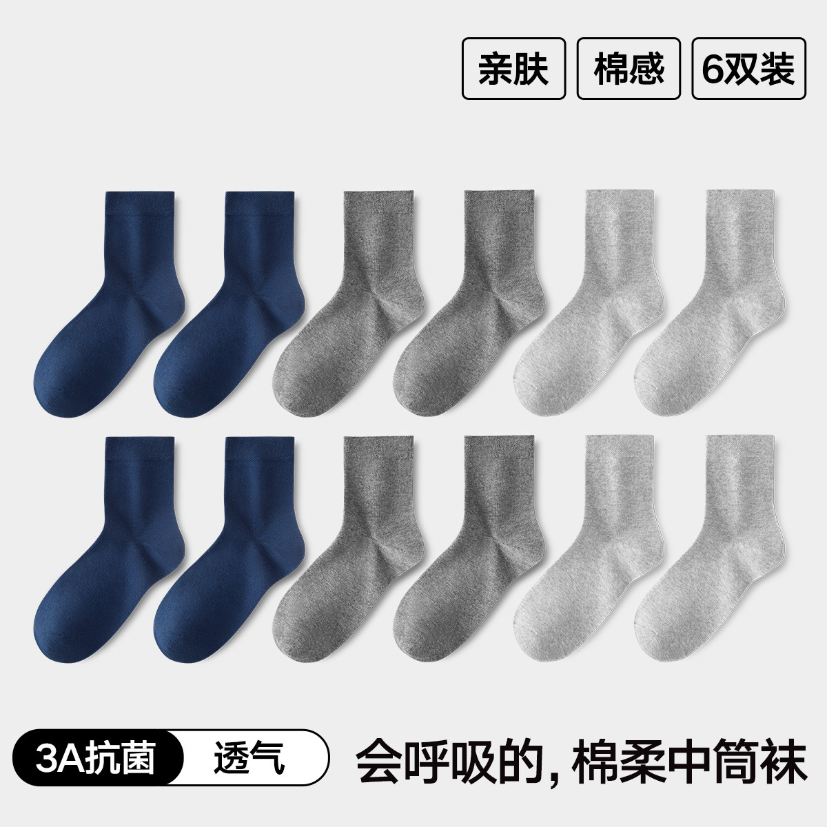 【3A抑菌 6双装】男士中筒袜棉柔透气商务休闲百搭纯色袜子男 977050