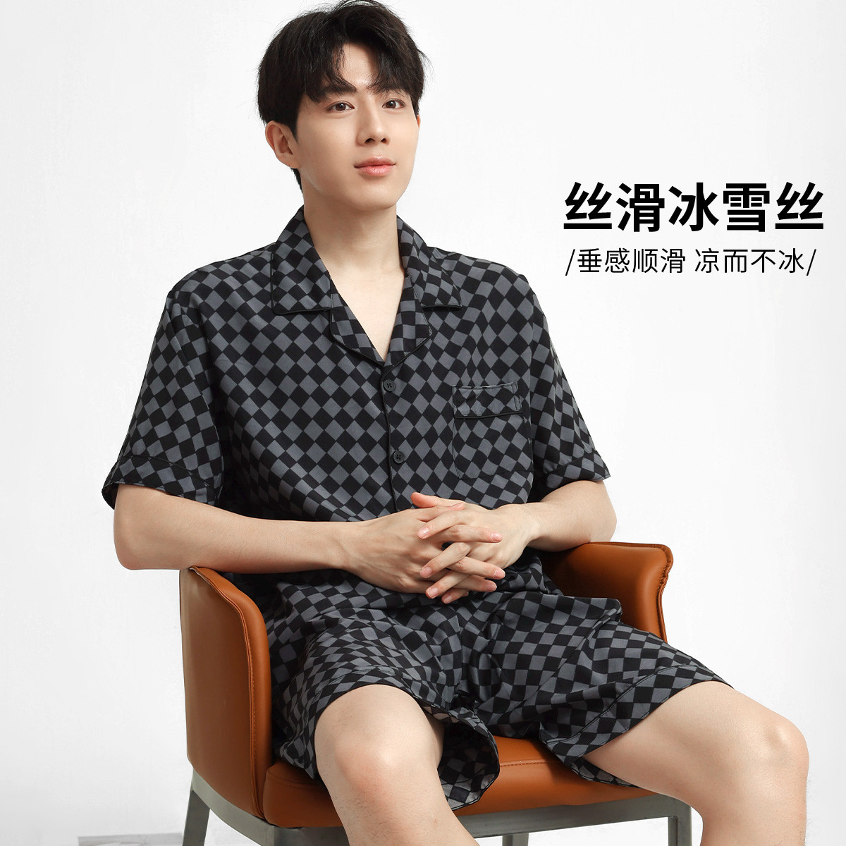 【冰雪丝】经典格纹翻领短袖套装男士家居服夏季轻薄凉爽柔软舒适 306251