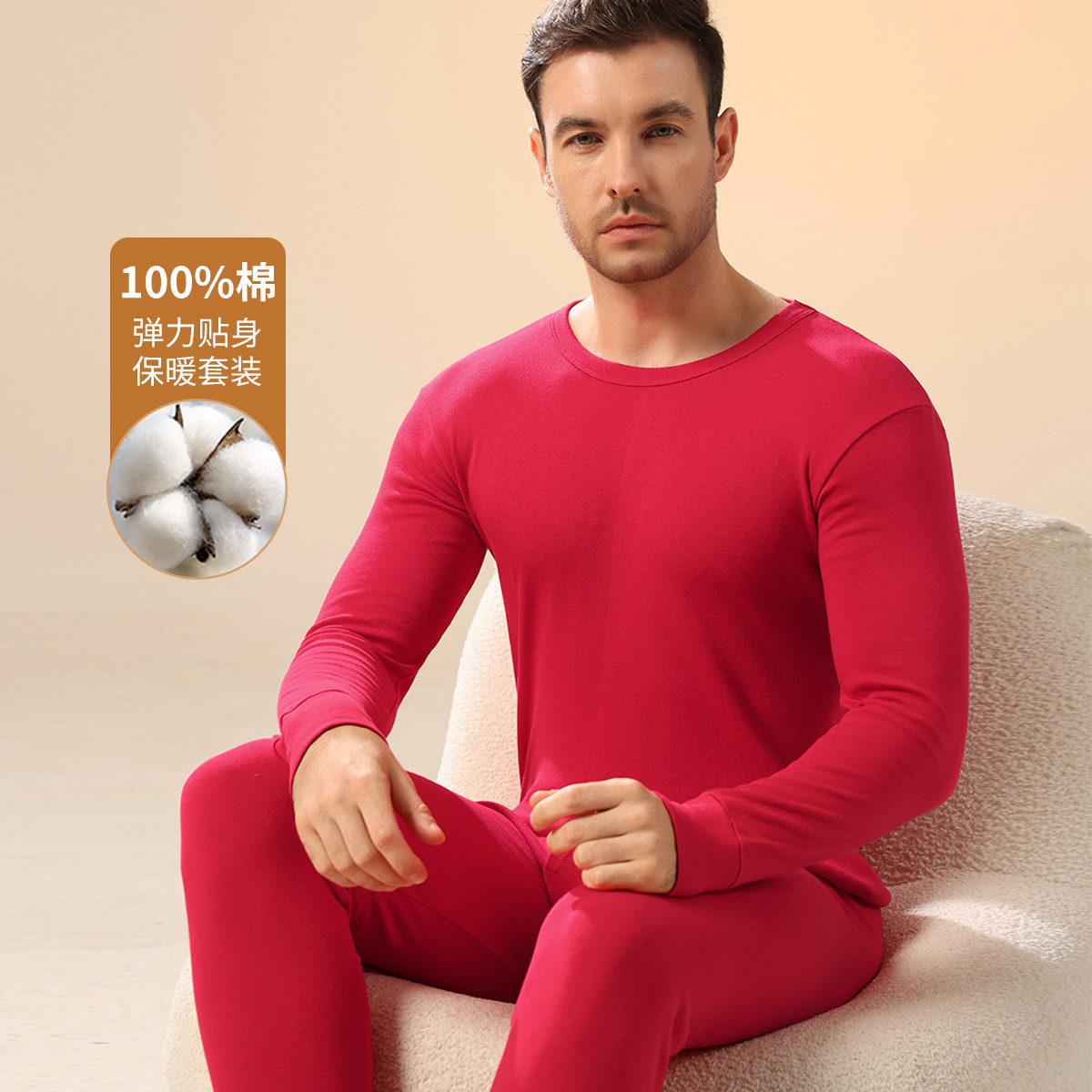 【100%棉】本命年大红纯棉秋衣秋裤男士保暖内衣男士无痕套装 366859