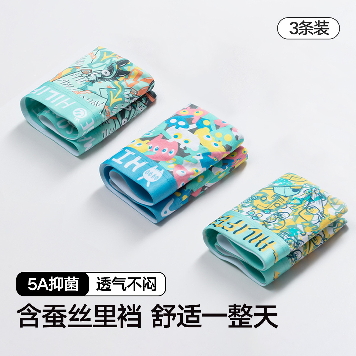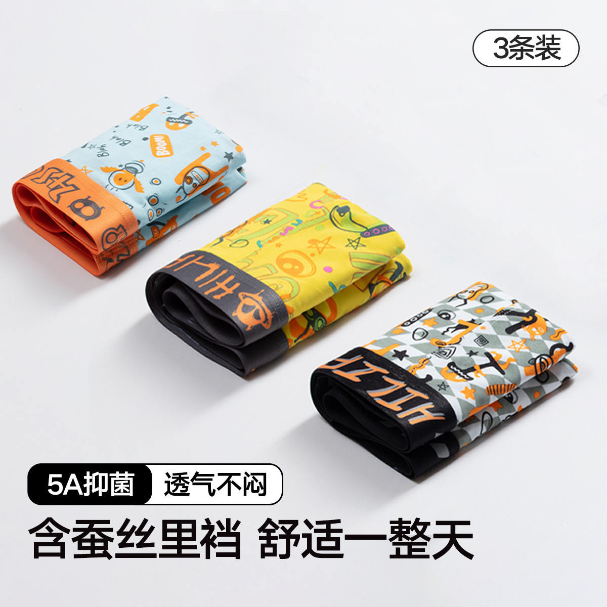 【含桑蚕丝 5A抑菌档】3条装男士内裤平角卡通印花可爱四角裤 852442