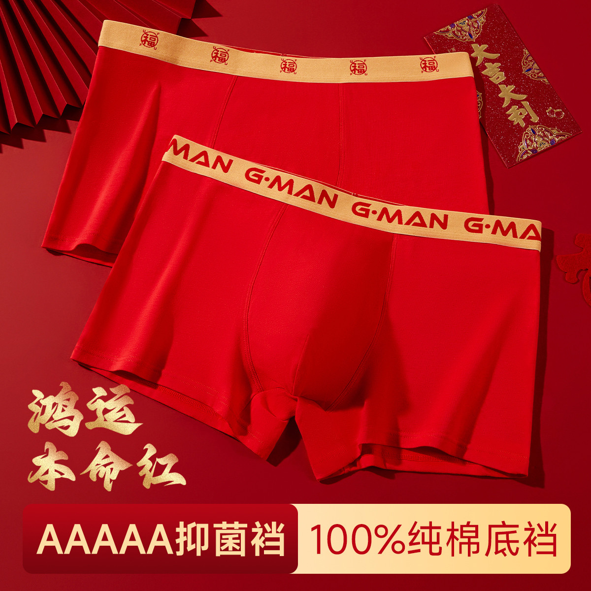 【2条装大红色内裤】鸿运结婚喜庆典高弹大码透气亲肤男士内裤男 974302