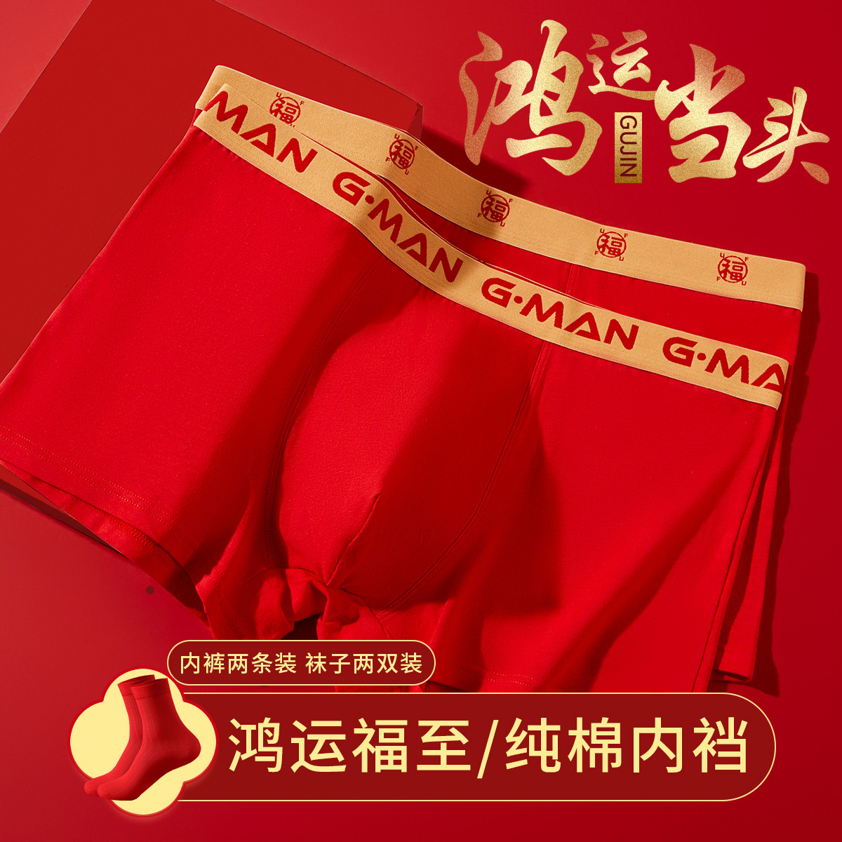 【鸿运4件套装】纯棉里裆本命大红色平角男士内裤婚嫁上岸袜子男 581259