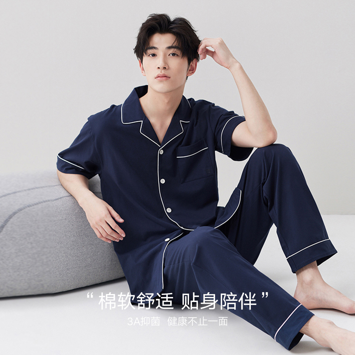 【100%纯棉 3A抑菌】男士睡衣男短袖长裤家居服套装可外穿 004954