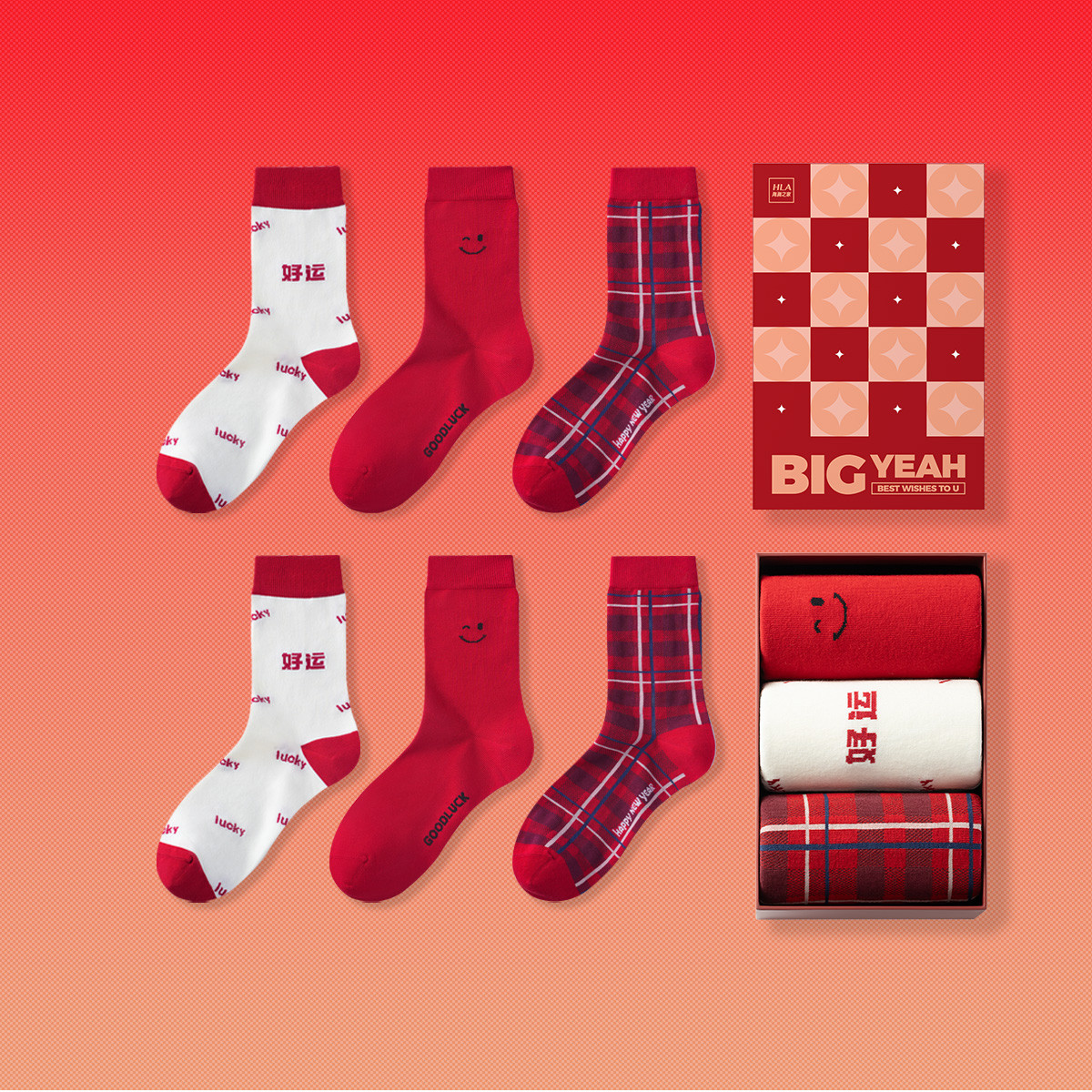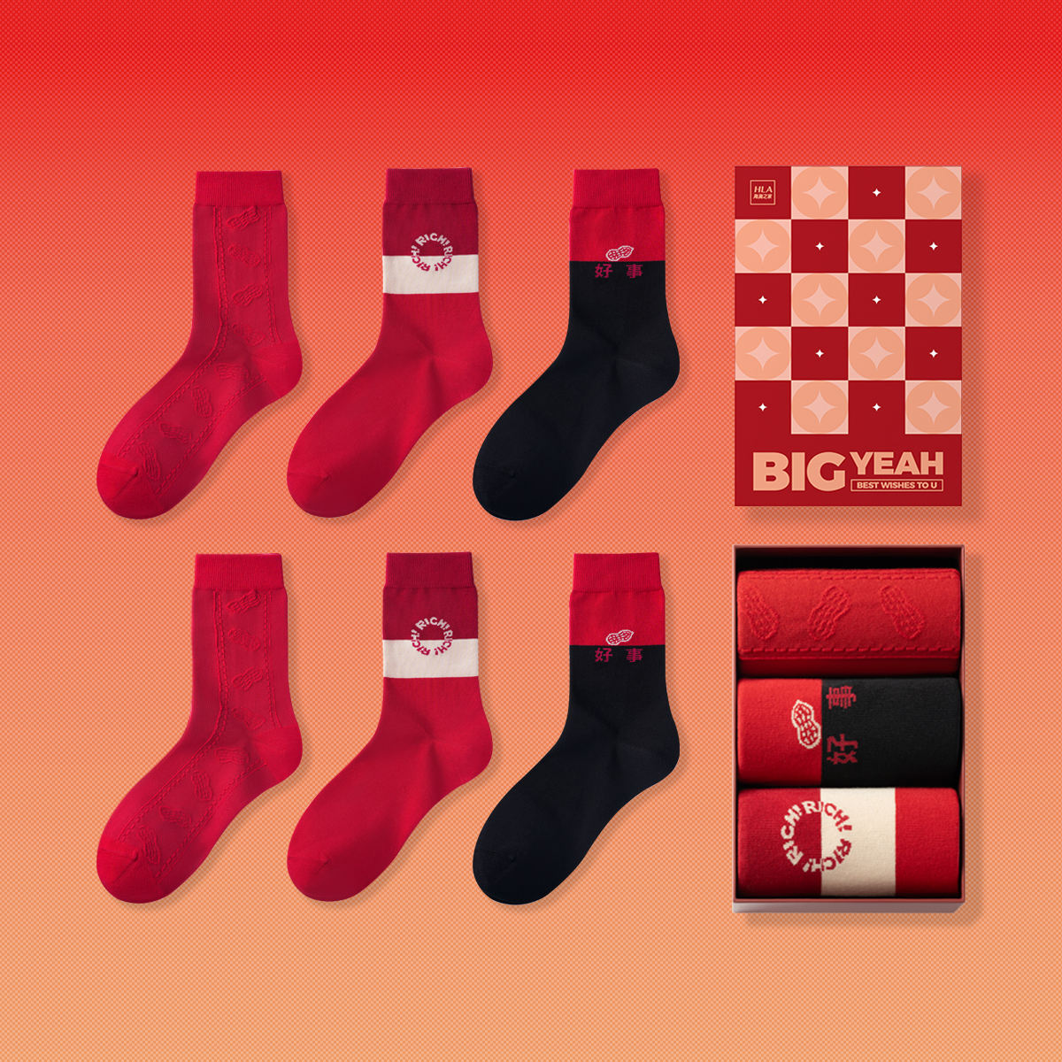 【鸿运礼盒】3双装本命蛇年男士中筒袜子大红色抑菌消臭棉柔男袜 261274