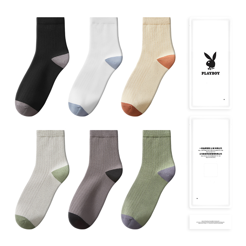 花花公子5双装男士袜子男式纯色中筒袜吸汗长筒袜春秋季防臭棉袜男袜信封袋独立包装