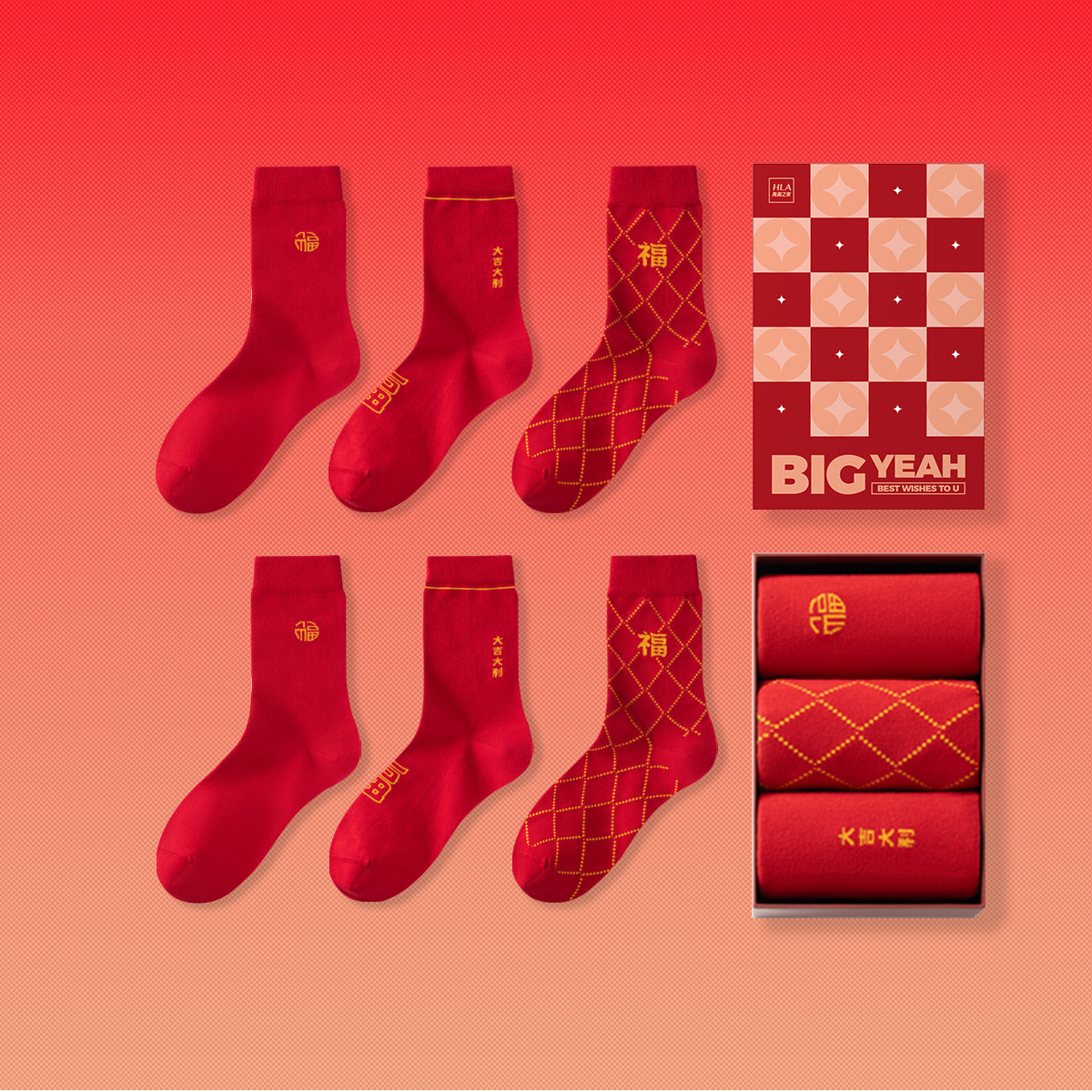 【鸿运礼盒 抑菌消臭】3双装袜子男本命年红色喜庆婚嫁中筒福袜 980378
