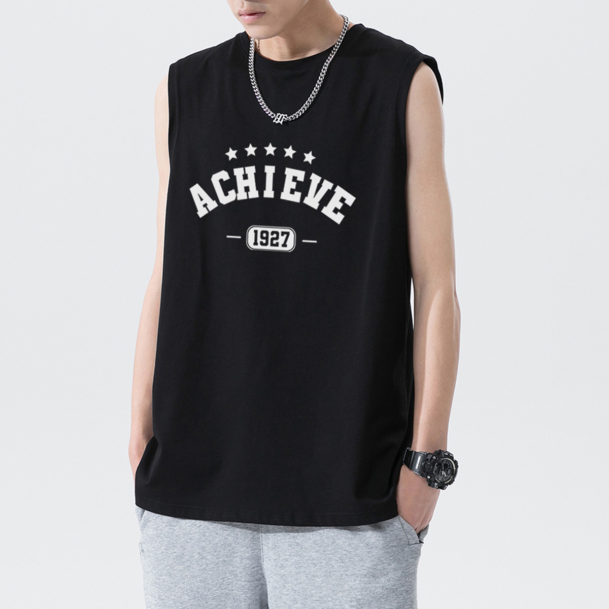 背心男士夏季纯棉透气美式男士无袖背心宽松潮流运动针织T恤 223059